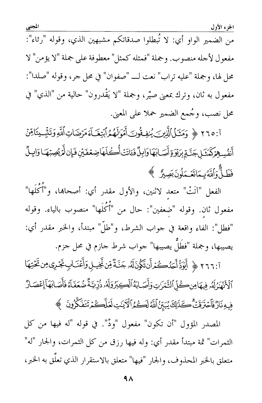 المصدر المؤول «أن تكون» مفعول «ودَّ» . في قوله «له فيها من كل الثمرات» ثمة مبتدأ مقدر أي: وله فيها رزق من كل الثمرات، والجار «له» متعلق بالخبر المحذوف، والجار «فيها» متعلق بالاستقرار الذي تعلَّق به الخبر، -[99]- والجار «من كل» متعلق بنعت لرزق. وجملة «له فيها رزق» نعت ثان لـ «جنة» في محل رفع. والواو في «وأصابه» حالية، والجملة حالية، وكذا الواو في «وله ذرية» . وجملة «فيه نار» صفة لـ «إعصار» . والكاف في «كذلك» نائب مفعول مطلق أي: يبيِّن تبيينا مثل ذلك التبيين، وجملة «لعلكم تتفكرون» مستأنفة لا محل لها.