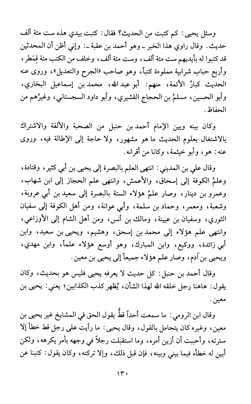 وسئل يحيى: كم كتبت من الحديث؟ فقال: كتبت بيدي هذه ست مئة ألف حديث. وقال راوي هذا الخبر - وهو أحمد بن عقبة -: وإني أظن أن المحدثين قد كتبوا له بأيديهم ست مئة ألف، وست مئة ألف، وخلف من الكتب مئة قِمَطر، وأربع حباب شرابية مملوءة كتبًا، وهو صاحب "الجرح والتعديل"، وروى عنه الحديث كبارُ الأئمة، منهم: أبو عبد الله، محمد بن إسماعيل البخاري، وأبو الحسين، مسلمُ بن الحجاج القشيري، وأبو داود السجستاني، وغيرُهم من الحفاظ.