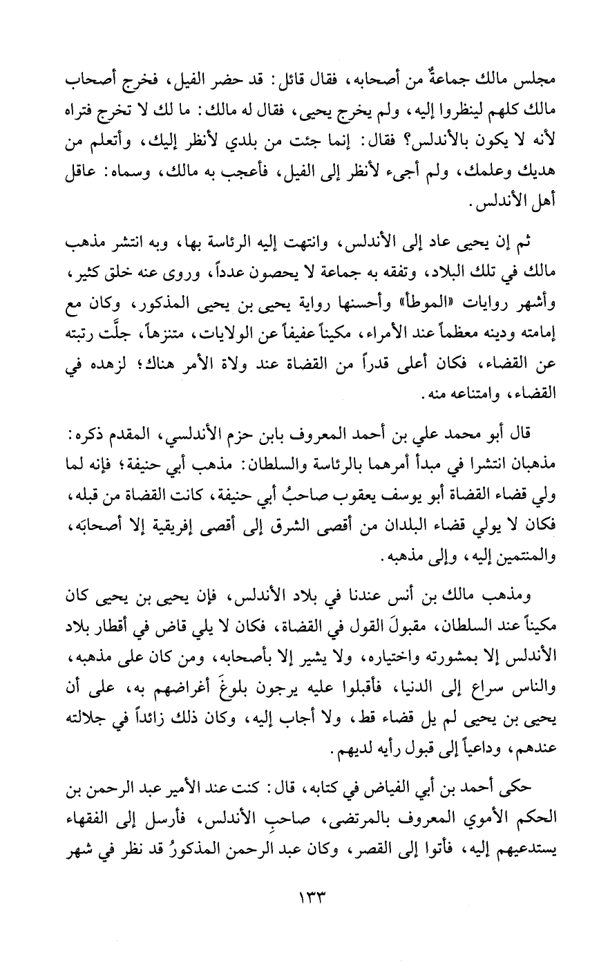 ومذهب مالك بن أنس عندنا في بلاد الأندلس، فإن يحيى بن يحيى كان مكينًا عند السلطان، مقبولَ القول في القضاة، فكان لا يلي قاض في أقطار بلاد الأندلس إلا بمشورته واختياره، ولا يشير إلا بأصحابه، ومن كان على مذهبه، والناس سراع إلى الدنيا، فأقبلوا عليه يرجون بلوغَ أغراضهم به، على أن يحيى بن يحيى لم يل قضاء قط، ولا أجاب إليه، وكان ذلك زائدًا في جلالته عندهم، وداعيًا إلى قبول رأيه لديهم.