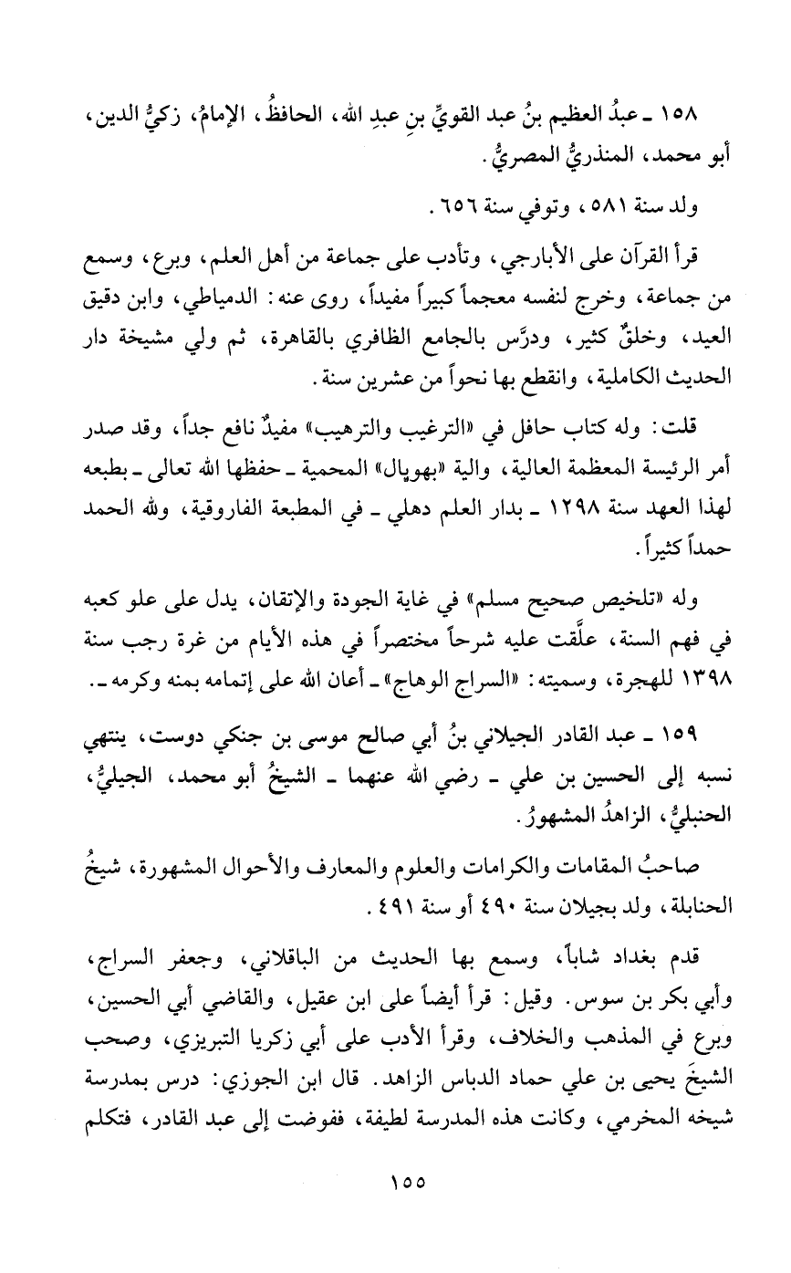 159 - عبد القادر الجيلاني بنُ أبي صالح موسى بن جنكي دوست، ينتهي نسبه إلى الحسين بن علي - رضي الله عنهما - الشيخُ أبو محمد، الجيليُّ، الحنبليُّ، الزاهدُ المشهورُ.