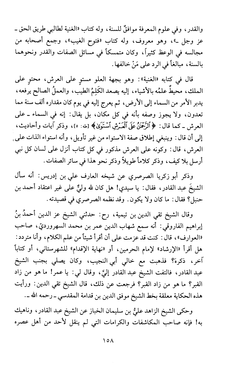 قال في كتابه "الغنية": وهو بجهة العلو مستوٍ على العرش، محتوٍ على الملك، محيطٌ علمُه بالأشياء، إليه يصعد الكَلِمُ الطيب، والعملُ الصالح يرفعه، يدبر الأمر من السماء إلى الأرض، ثم يعرج إليه في يوم كان مقداره ألف سنة مما تعدون، ولا يجوز وصفه بأنه في كل مكان، بل يقال: إنه في السماء - على العرش - كما قال: {الرَّحْمَنُ عَلَى الْعَرْشِ اسْتَوَى} [طه: 5]، وذكر آيات وأحاديث، إلى أن قال: وينبغي إطلاق صفة الاستواء من غير تأويل، وأنه استواء الذات على العرش، قال: وكونه على العرش مذكور في كل كتاب أنزل على لسان كل نبي أرسل بلا كيف، وذكر كلاماً طويلاً وذكر نحو هذا في سائر الصفات.