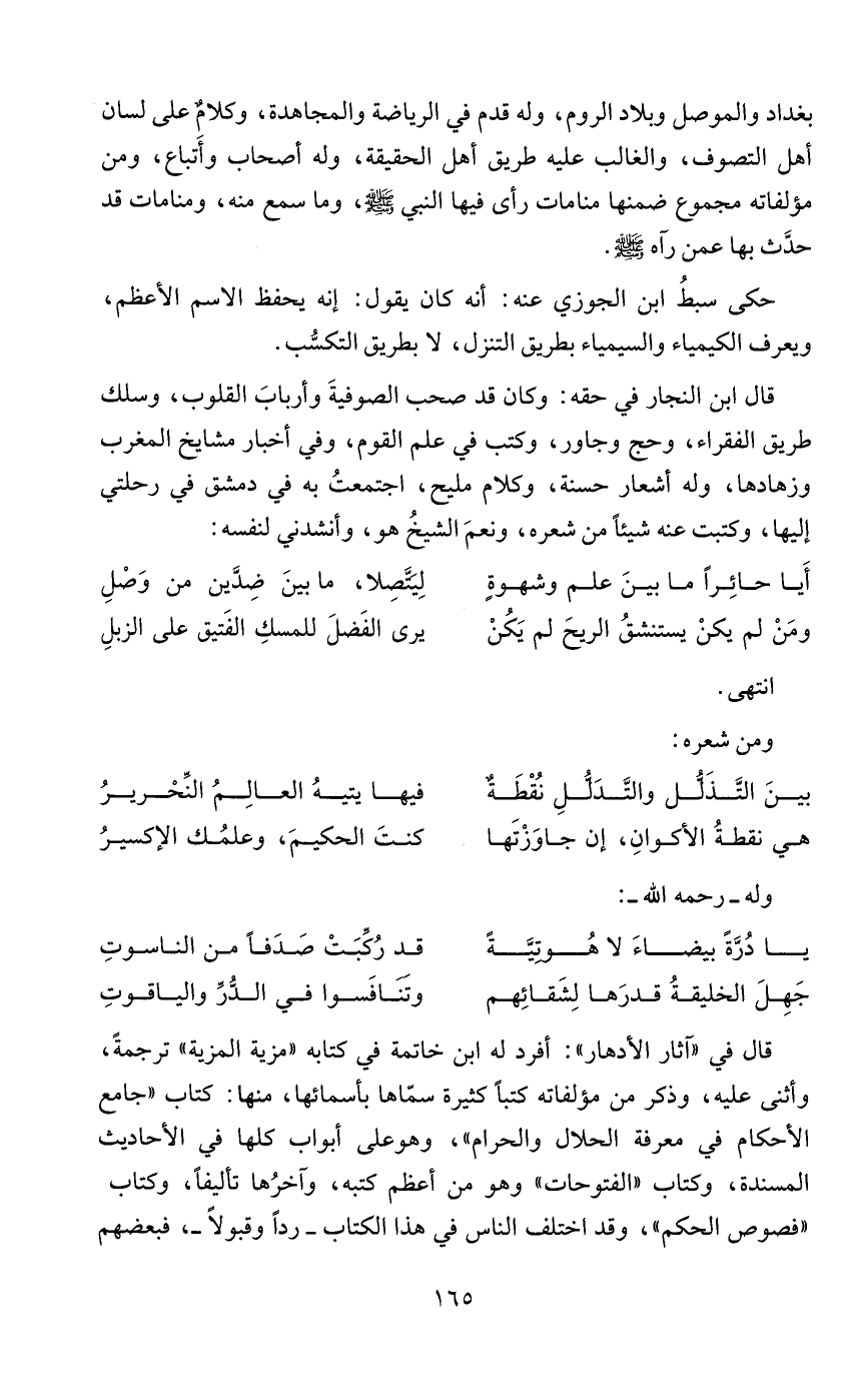 قال ابن النجار في حقه: وكان قد صحب الصوفيةَ وأربابَ القلوب، وسلك طريق الفقراء، وحج وجاور، وكتب في علم القوم، وفي أخبار مشايخ المغرب وزهادها، وله أشعار حسنة، وكلام مليح، اجتمعتُ به في دمشق في رحلتي إليها، وكتبت عنه شيئًا من شعره، ونعمَ الشيخُ هو، وأنشدني لنفسه: