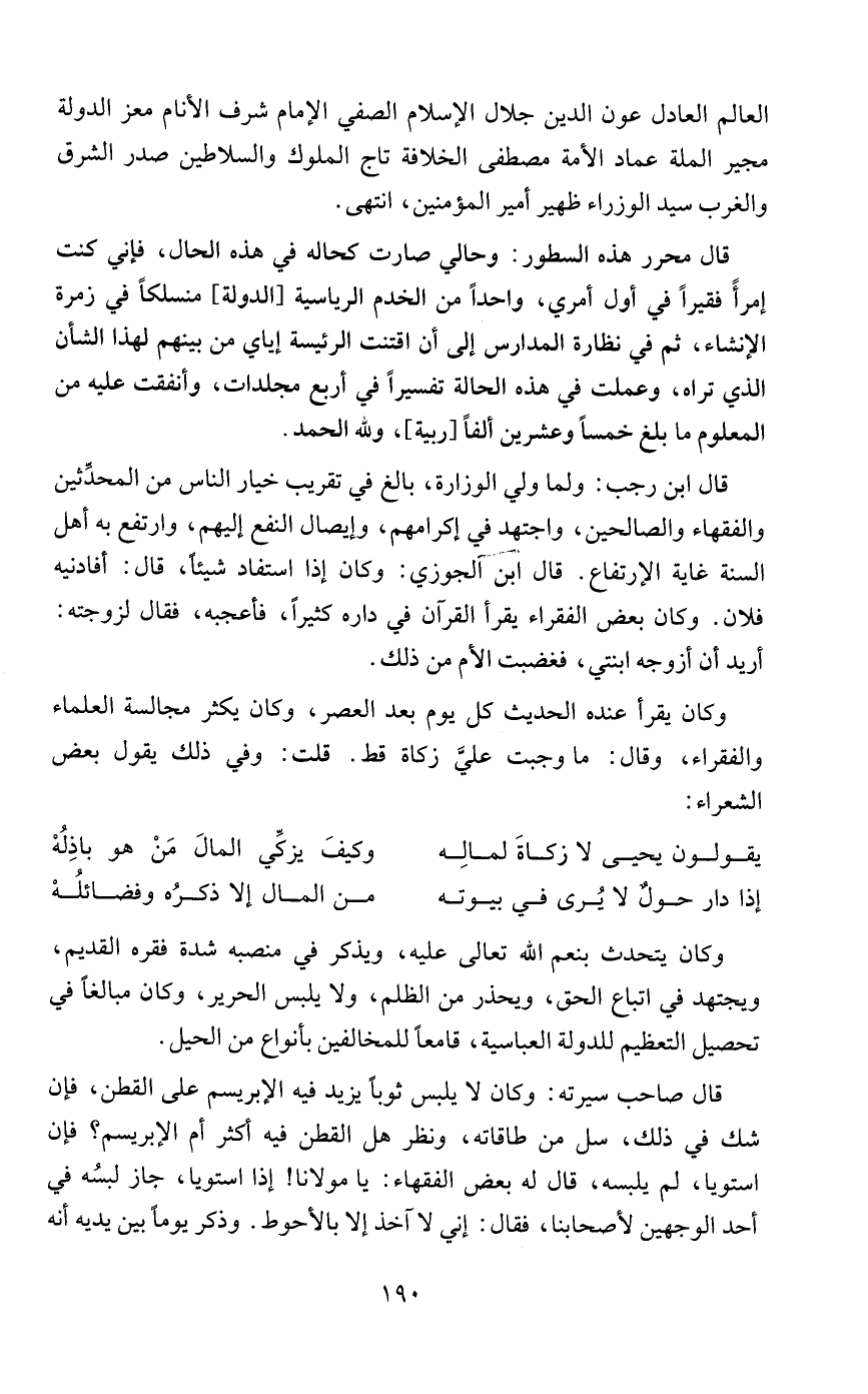 وكان يقرأ عنده الحديث كل يوم بعد العصر، وكان يكثر مجالسة العلماء والفقراء، وقال: ما وجبت عليَّ زكاة قط. قلت: وفي ذلك يقول بعض الشعراء: