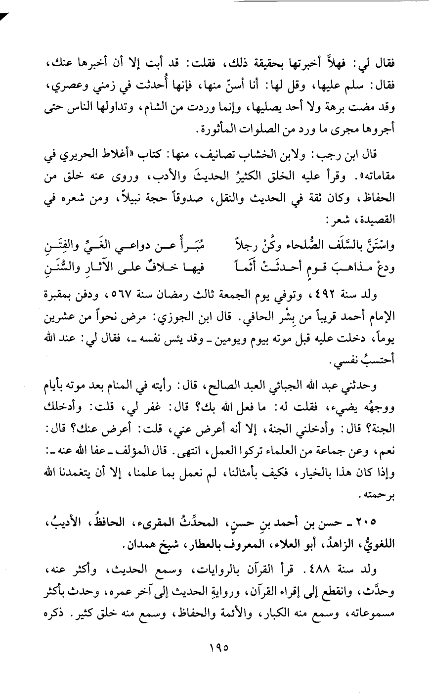 205 - حسن بن أحمد بنِ حسنٍ، المحدِّثُ المقرىء، الحافظُ، الأديبُ، اللغويُّ، الزاهدُ، أبو العلاء، المعروف بالعطار، شيخ همدان.