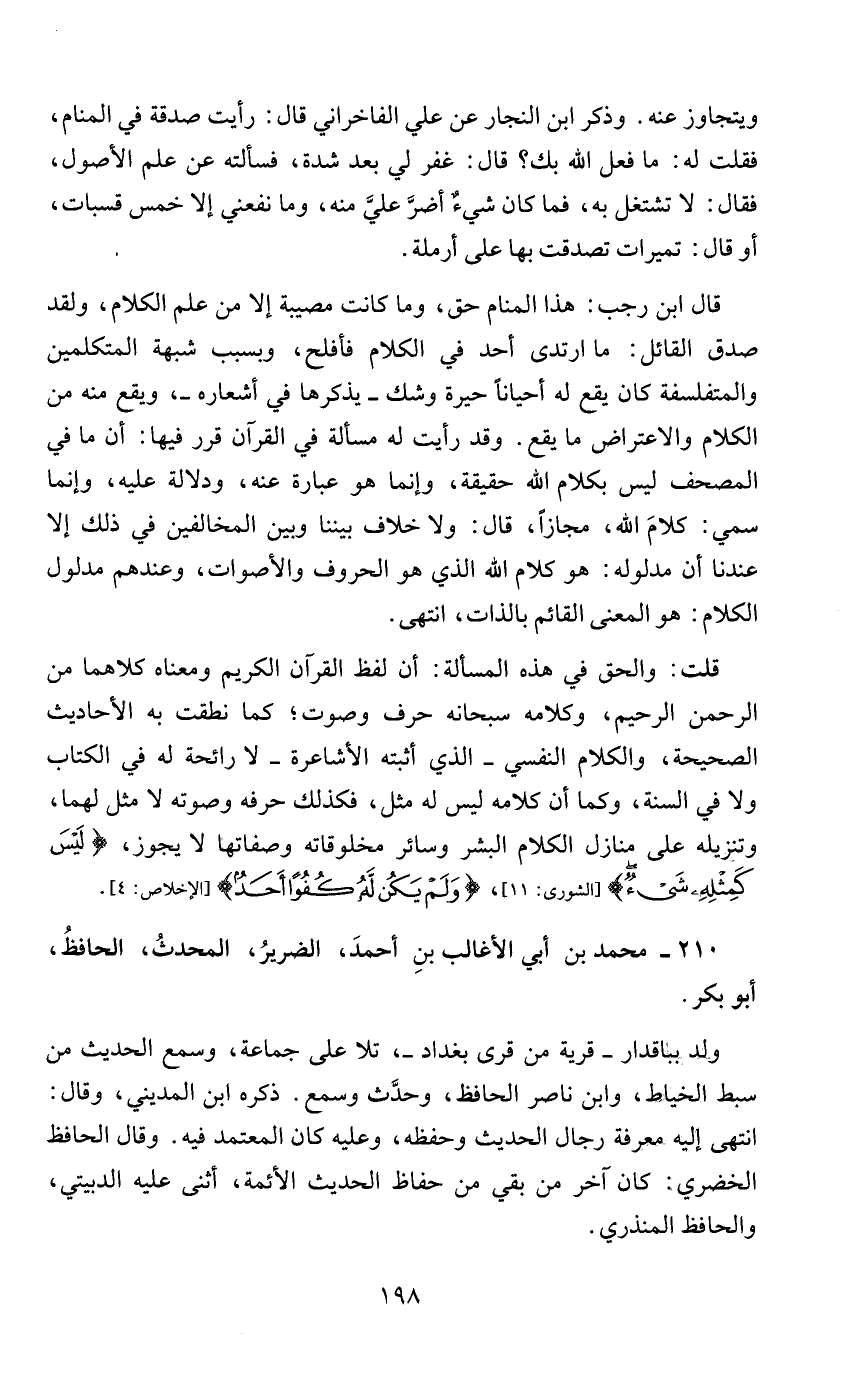 قال ابن رجب: هذا المنام حق، وما كانت مصيبة إلا من علم الكلام، ولقد صدق القائل: ما ارتدى أحد في الكلام فأفلح، وبسبب شبهة المتكلمين والمتفلسفة كان يقع له أحيانًا حيرة وشك - يذكرها في أشعاره -، ويقع منه من الكلام والاعتراض ما يقع. وقد رأيت له مسألة في القرآن قرر فيها: أن ما في المصحف ليس بكلام الله حقيقة، وإنما هو عبارة عنه، ودلالة عليه، وإنما سمي: كلامَ الله، مجازًا، قال: ولا خلاف بيننا وبين المخالفين في ذلك إلا عندنا أن مدلوله: هو كلام الله الذي هو الحروف والأصوات، وعندهم مدلول الكلام: هو المعنى القائم بالذات، انتهى.