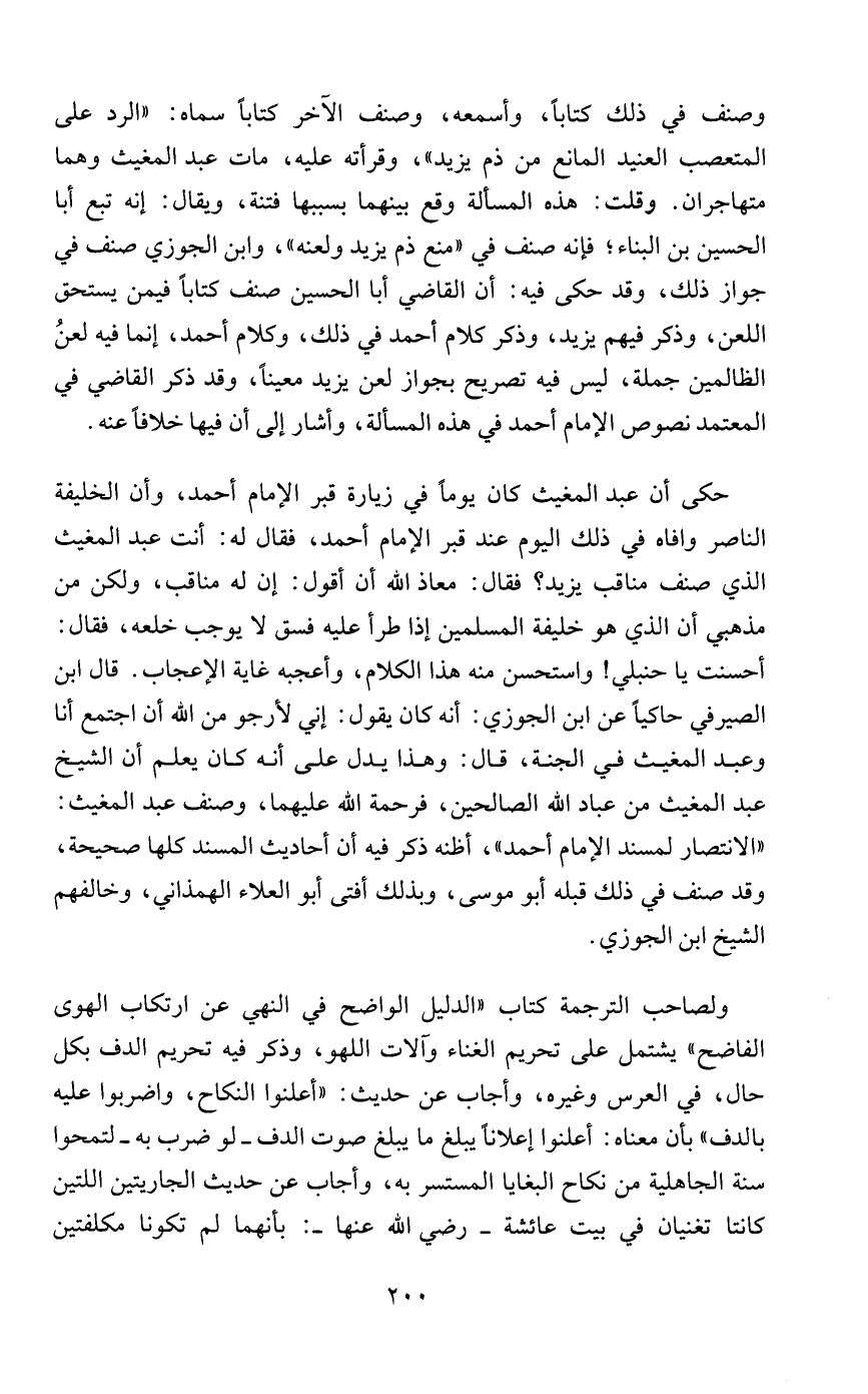 وصنف في ذلك كتابًا، وأسمعه، وصنف الآخر كتابًا سماه: "الرد على المتعصب العنيد المانع من ذم يزيد"، وقرأته عليه، مات عبد المغيث وهما متهاجران. وقلت: هذه المسألة وقع بينهما بسببها فتنة، ويقال: إنه تبع أبا الحسين بن البناء؛ فإنه صنف في "منع ذم يزيد ولعنه"، وابن الجوزي صنف في جواز ذلك، وقد حكى فيه: أن القاضي أبا الحسين صنف كتابًا فيمن يستحق اللعن، وذكر فيهم يزيد، وذكر كلام أحمد في ذلك، وكلام أحمد، إنما فيه لعنُ الظالمين جملة، ليس فيه تصريح بجواز لعن يزيد معينًا، وقد ذكر القاضي في المعتمد نصوص الإمام أحمد في هذه المسألة، وأشار إلى أن فيها خلافًا عنه.