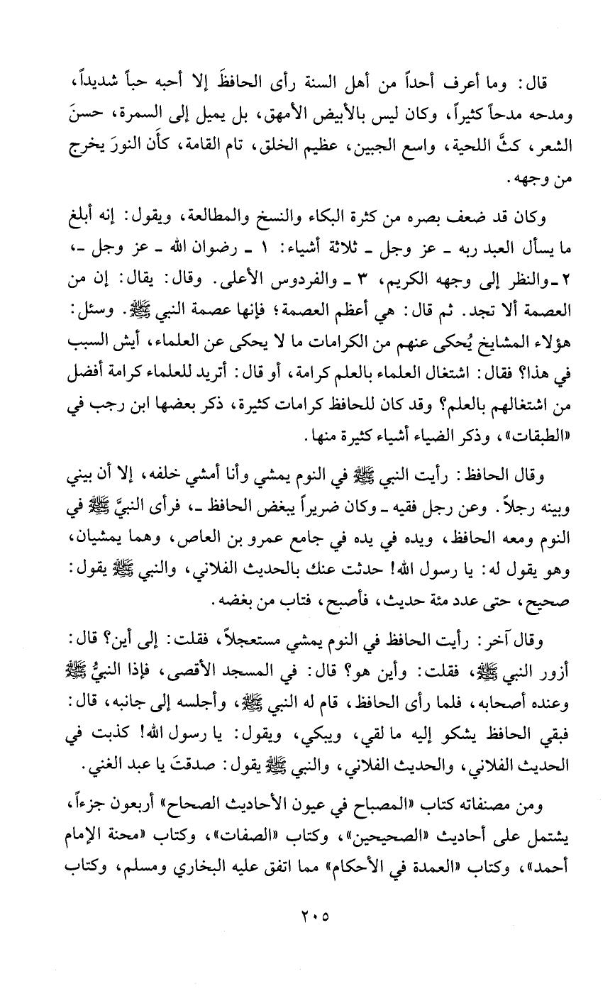 وكان قد ضعف بصره من كثرة البكاء والنسخ والمطالعة، ويقول: إنه أبلغ ما يسأل العبد ربه - عز وجل - ثلاثة أشياء: 1 - رضوان الله - عز وجل -، 2 - والنظر إلى وجهه الكريم، 3 - والفردوس الأعلى. وقال: يقال: إن من العصمة ألا تجد. ثم قال: هي أعظم العصمة؛ فإنها عصمة النبي - صلى الله عليه وسلم -. وسئل: هؤلاء المشايخ يُحكى عنهم من الكرامات ما لا يحكى عن العلماء، أيش السبب في هذا؟ فقال: اشتغال العلماء بالعلم كرامة، أو قال: أتريد للعلماء كرامة أفضل من اشتغالهم بالعلم؟ وقد كان للحافظ كرامات كثيرة، ذكر بعضها ابن رجب في "الطبقات"، وذكر الضياء أشياء كثيرة منها.