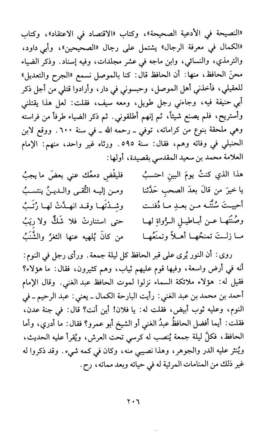 "النصيحة في الأدعية الصحيحة"، وكتاب "الاقتصاد في الاعتقاد"، وكتاب "الكمال في معرفة الرجال" يشتمل على رجال "الصحيحين"، وأبي داود، والترمذي، والنسائي، وابن ماجه في عشر مجلدات، وفيه إسناده وذكر الضياء محنَ الحافظ، منها: أن الحافظ قال: كنا بالموصل نسمع "الجرح والتعديل" للعقيلي، فأخذني أهل الموصل، وحبسوني في دار، وأرادوا قتلي من أجل ذكر أبي حنيفة فيه، وجاءني رجل طويل، ومعه سيف، فقلت: لعل هذا يقتلني وأستريح، فلم يصنع شيئًا، ثم إنهم أطلقوني. ثم ذكر الضياء طرفًا من فراسته وهي ملحقة بنوع من كراماته، توفي - رحمه الله - في سنة 600. ووقع لابن الحنبلي في وفاته وهم، فقال: سنة 595. ورثاه غير واحد، منهم: الإمام العلامة محمد بن سعيد المقدسي بقصيدة، أولها: