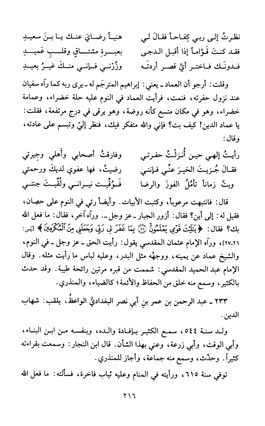 وقلت: أرجو أن العماد - يعني: إبراهيم المترجَم له - يرى ربه كما رآه سفيان عند نزول حفرته، فنمت، فرأيت العماد في النوم عليه حلة خضراء، وعمامة خضراء، وهو في مكان متسع كأنه روضة، وهو يرقى في درج مرتفعة، فقلت: يا عماد الدين! كيف بت؟ فإني والله متفكر فيك، فنظر إليّ وتبسم على عادته، وقال:
