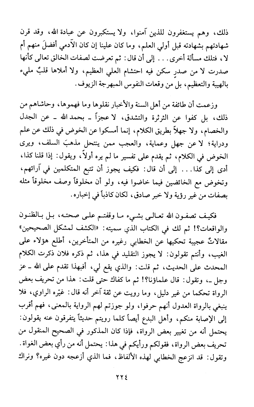 فكيف تصفون الله تعالى بشيء ما وقفتم على صحته، بل بالظنون والواقعات؟! ثم لك في الكتاب الذي سميته: "الكشف لمشكل الصحيحين" مقالاتٌ عجيبة تحكيها عن الخطابي وغيره من المتأخرين، أطلع هؤلاء على الغيب، وأنتم تقولون: لا يجوز التقليد في هذا، ثم ذكره فلان ذكرت الكلام المحدث على الحديث، ثم قلت: والذي يقع لي، أفبهذا تقدم على الله - عز وجل -، وتقول: قال علماؤنا؟! ثم ما كفاك حتى قلت: هذا من تحريف بعض الرواة تحكما من غير دليل، وما رويت عن ثقة آخر أنه قال: غيّره الراوي، فلا ينبغي بالرواة العدول أنهم حرفوا، ولو جوزتم لهم الرواية بالمعنى، فهم أقرب إلى الإصابة منكم، وأهل البدع أيضًا كما رويتم حديثًا يتفرقون عنه يقولون: يحتمل أنه من تغيير بعض الرواة، فإذا كان المذكور في الصحيح المنقول من تحريف بعض الرواة، فقولكم ورأيكم في هذا: يحتمل أنه من رأي بعض الغواة. وتقول: قد انزعج الخطابي لهذه الألفاظ، فما الذي أزعجه دون غيره؟ ونراك