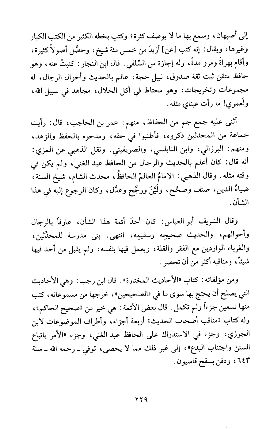 ومن مؤلفاته: كتاب "الأحاديث المختارة". قال ابن رجب: وهي الأحاديث التي يصلح أن يحتج بها سوى ما في "الصحيحين"، خرجها من مسموعاته، كتب منها تسعين جزءًا ولم تكمل. قال بعض الأئمة: هي خير من "صحيح الحاكم"، وله كتاب "مناقب أصحاب الحديث" أربعة أجزاء، وأطراف الموضوعات لابن الجوزي، وجزء في الاستدراك على الحافظ عبد الغني، وجزء "الأمر باتباع السنن واجتناب البدع"، إلى غير ذلك مما لا يحصى، توفي - رحمه الله - سنة 643، ودفن بسفح قاسيون.