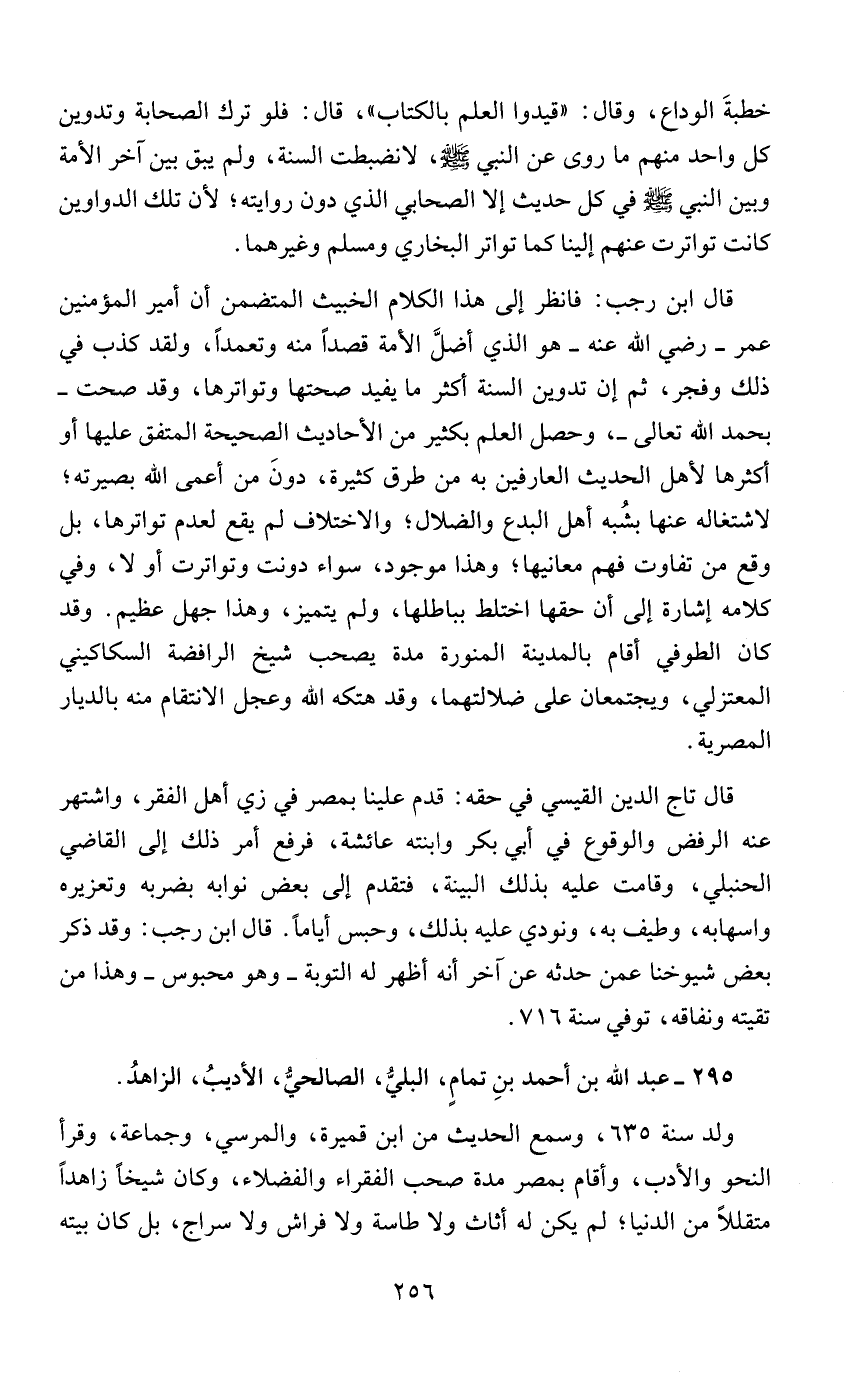 قال ابن رجب: فانظر إلى هذا الكلام الخبيث المتضمن أن أمير المؤمنين عمر - رضي الله عنه - هو الذي أضلَّ الأمة قصدًا منه وتعمدًا، ولقد كذب في ذلك وفجر، ثم إن تدوين السنة اكثر ما يفيد صحتها وتواترها، وقد صحت - بحمد الله تعالى -، وحصل العلم بكثير من الأحاديث الصحيحة المتفق عليها أو اكثرها لأهل الحديث العارفين به من طرق كثيرة، دونَ من أعمى الله بصيرته؛ لاشتغاله عنها بشُبه أهل البدع والضلال؛ والاختلاف لم يقع لعدم تواترها، بل وقع من تفاوت فهم معانيها؛ وهذا موجود، سواء دونت وتواترت أو لا، وفي كلامه إشارة إلى أن حقها اختلط بباطلها، ولم يتميز، وهذا جهل عظيم. وقد كان الطوفي أقام بالمدينة المنورة مدة يصحب شيخ الرافضة السكاكيني المعتزلي، ويجتمعان على ضلالتهما، وقد هتكه الله وعجل الانتقام منه بالديار المصرية.