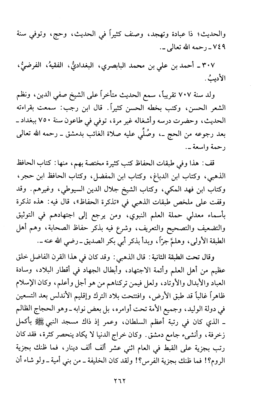 وقال تحت الطبقة الثانية: قال الذهبي: وقد كان في هذا القرن الفاضل خلق عظيم من أهل العلم وأئمة الاجتهاد، وأبطال الجهاد في أقطار البلاد، وسادة العباد والأبدال والأوتاد، ولعل فيمن تركناهم من هو أجل وأعلم، وكان الإسلام ظاهرًا غالبًا قد طبق الأرض، وافتتحت بلاد الترك وإقليم الأندلس بعد التسعين في دولة الوليد، وجميع الأمة تحت أوامره، بل بعض نوابه - وهو الحجاج الظالم - الذي كان في رتبة أعظم السلطان، وعمر إذ ذاك مسجد النبي - صلى الله عليه وسلم - بأكمل زخرفة، وأنشىء جامع دمشق. وكان خراج الدنيا لا يكاد ينحصر كثرة، فقد كان رتب بجزية على القبط في العام اثني عشر ألف ألف دينار، فما ظنك بجزية الروم؟! فما ظنك بجزية الفرس؟! ولقد كان الخليفة - من بني أمية - ولو شاء أن
