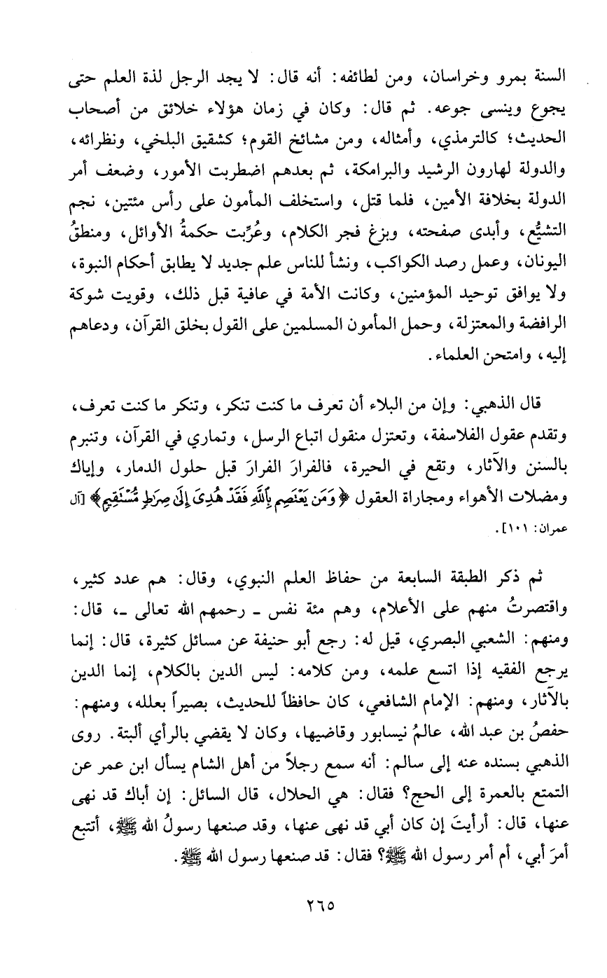 السنة بمرو وخراسان، ومن لطائفه: أنه قال: لا يجد الرجل لذة العلم حتى يجوع وينسى جوعه. ثم قال: وكان في زمان هؤلاء خلائق من أصحاب الحديث؛ كالترمذي، وأمثاله، ومن مشائخ القوم؛ كشقيق البلخي، ونظرائه، والدولة لهارون الرشيد والبرامكة، ثم بعدهم اضطربت الأمور، وضعف أمر الدولة بخلافة الأمين، فلما قتل، واستخلف المأمون على رأس مئتين، نجم التشيُّع، وأبدى صفحته، وبزغ فجر الكلام، وعُرِّبت حكمةُ الأوائل، ومنطقُ اليونان، وعمل رصد الكواكب، ونشأ للناس علم جديد لا يطابق أحكام النبوة، ولا يوافق توحيد المؤمنين، وكانت الأمة في عافية قبل ذلك، وقويت شوكة الرافضة والمعتزلة، وحمل المأمون المسلمين على القول بخلق القرآن، ودعاهم إليه، وامتحن العلماء.