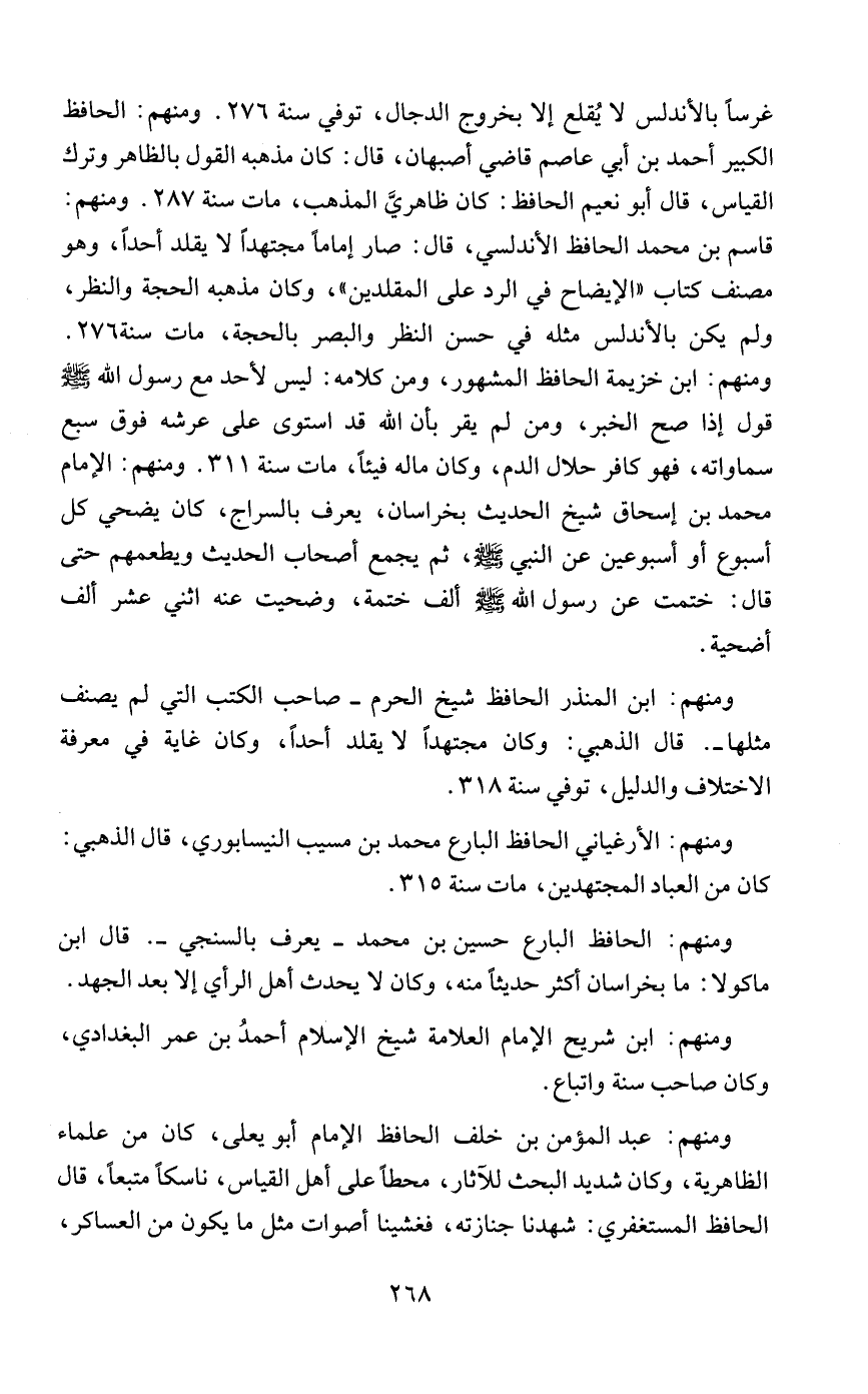 غرسًا بالأندلس لا يُقلع إلا بخروج الدجال، توفي سنة 276. ومنهم: الحافظ الكبير أحمد بن أبي عاصم قاضي أصبهان، قال: كان مذهبه القول بالظاهر وترك القياس، قال أبو نعيم الحافظ: كان ظاهريَّ المذهب، مات سنة 287. ومنهم: قاسم بن محمد الحافظ الأندلسي، قال: صار إمامًا مجتهدًا لا يقلد أحدًا، وهو مصنف كتاب "الإيضاح في الرد على المقلدين"، وكان مذهبه الحجة والنظر، ولم يكن بالأندلس مثله في حسن النظر والبصر بالحجة، مات سنة 276. ومنهم: ابن خزيمة الحافظ المشهور، ومن كلامه: ليس لأحد مع رسول الله - صلى الله عليه وسلم - قول إذا صح الخبر، ومن لم يقر بأن الله قد استوى على عرشه فوق سبع سماواته، فهو كافر حلال الدم، وكان ماله فيئًا، مات سنة 311. ومنهم: الإمام محمد بن إسحاق شيخ الحديث بخراسان، يعرف بالسراج، كان يضحي كل أسبوع أو أسبوعين عن النبي - صلى الله عليه وسلم -، ثم يجمع أصحاب الحديث ويطعمهم حتى قال: ختمت عن رسول الله - صلى الله عليه وسلم - ألف ختمة، وضحيت عنه اثني عشر ألف أضحية.