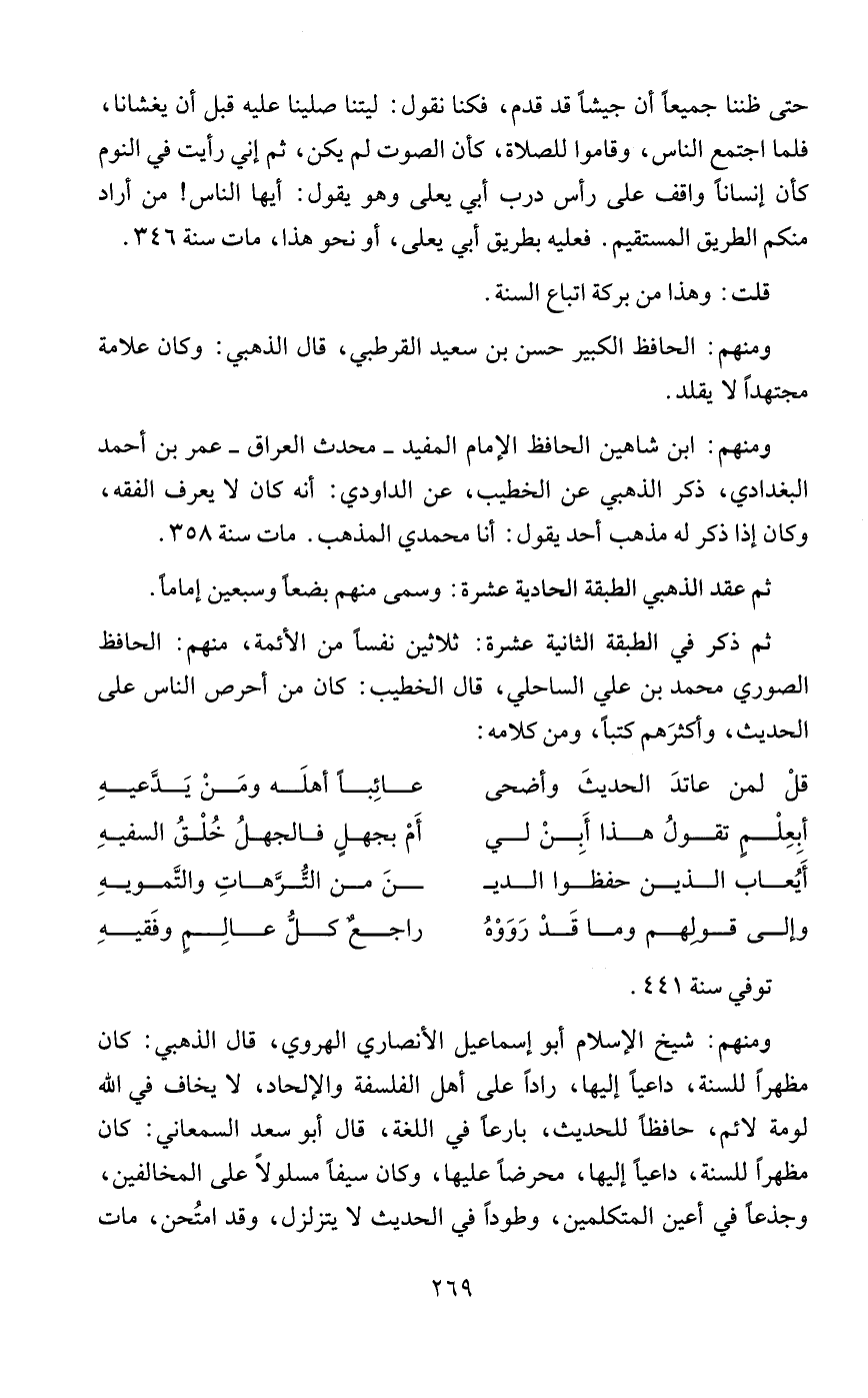 ومنهم: شيخ الإسلام أبو إسماعيل الأنصاري الهروي، قال الذهبي: كان مظهرًا للسنة، داعيًا إليها، رادًا على أهل الفلسفة والإلحاد، لا يخاف في الله لومة لائم، حافظًا للحديث، بارعًا في اللغة، قال أبو سعد السمعاني: كان مظهرًا للسنة، داعيًا إليها، محرضًا عليها، وكان سيفًا مسلولاً على المخالفين، وجذعًا في أعين المتكلمين، وطودًا في الحديث لا يتزلزل، وقد امتُحن، مات
