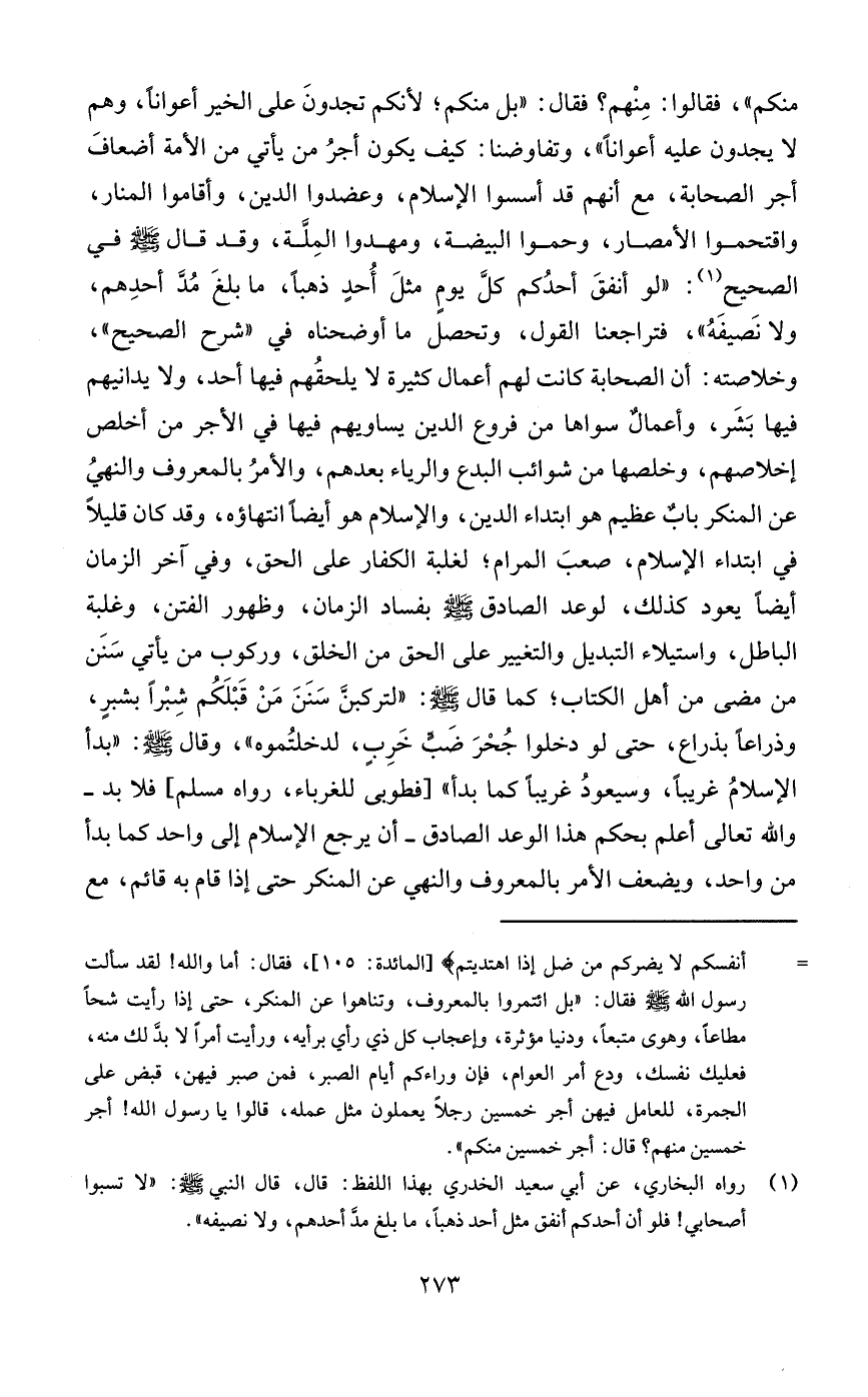 منكم"، فقالوا: مِنْهم؟ فقال: "بل منكم؛ لأنكم تجدونَ على الخير أعوانًا، وهم لا يجدون عليه أعوانًا"، وتفاوضنا: كيف يكون أجرُ من يأتي من الأمة أضعافَ أجر الصحابة، مع أنهم قد أسسوا الإسلام، وعضدوا الدين، وأقاموا المنار، واقتحموا الأمصار، وحموا البيضة، ومهدوا المِلَّة، وقد قال - صلى الله عليه وسلم - في الصحيح (¬1): "لو أنفقَ أحدُكم كلَّ يومٍ مثلَ أُحدٍ ذهبًا، ما بلغَ مُدَّ أحدِهم، ولا نَصيفَهُ"، فتراجعنا القول، وتحصل ما أوضحناه في "شرح الصحيح"، وخلاصته: أن الصحابة كانت لهم أعمال كثيرة لا يلحقُهم فيها أحد، ولا يدانيهم فيها بَشَر، وأعمالٌ سواها من فروع الدين يساويهم فيها في الأجر من أخلص إخلاصهم، وخلصها من شوائب البدع والرياء بعدهم، والأمرُ بالمعروف والنهيُ عن المنكر بابٌ عظيم هو ابتداء الدين، والإسلام هو أيضًا انتهاؤه، وقد كان قليلاً في ابتداء الإسلام، صعبَ المرام؛ لغلبة الكفار على الحق، وفي آخر الزمان أيضًا يعود كذلك، لوعد الصادق - صلى الله عليه وسلم - بفساد الزمان، وظهور الفتن، وغلبة الباطل، واستيلاء التبديل والتغيير على الحق من الخلق، وركوب من يأتي سَنَن من مضى من أهل الكتاب؛ كما قال - صلى الله عليه وسلم -: "لتركبنَّ سَنَنَ مَنْ قَبْلَكُم شِبْرًا بشبرٍ، وذراعًا بذراع، حتى لو دخلوا جُحْرَ ضَبٍّ خَرِبٍ، لدخلتُموه"، وقال - صلى الله عليه وسلم -: "بدأ الإسلامُ غريبًا، وسيعودُ غريبًا كما بدأ" [فطوبى للغرباء، رواه مسلم] فلا بد - والله تعالى أعلم بحكم هذا الوعد الصادق - أن يرجع الإسلام إلى واحد كما بدأ من واحد، ويضعف الأمر بالمعروف والنهي عن المنكر حتى إذا قام به قائم، مع