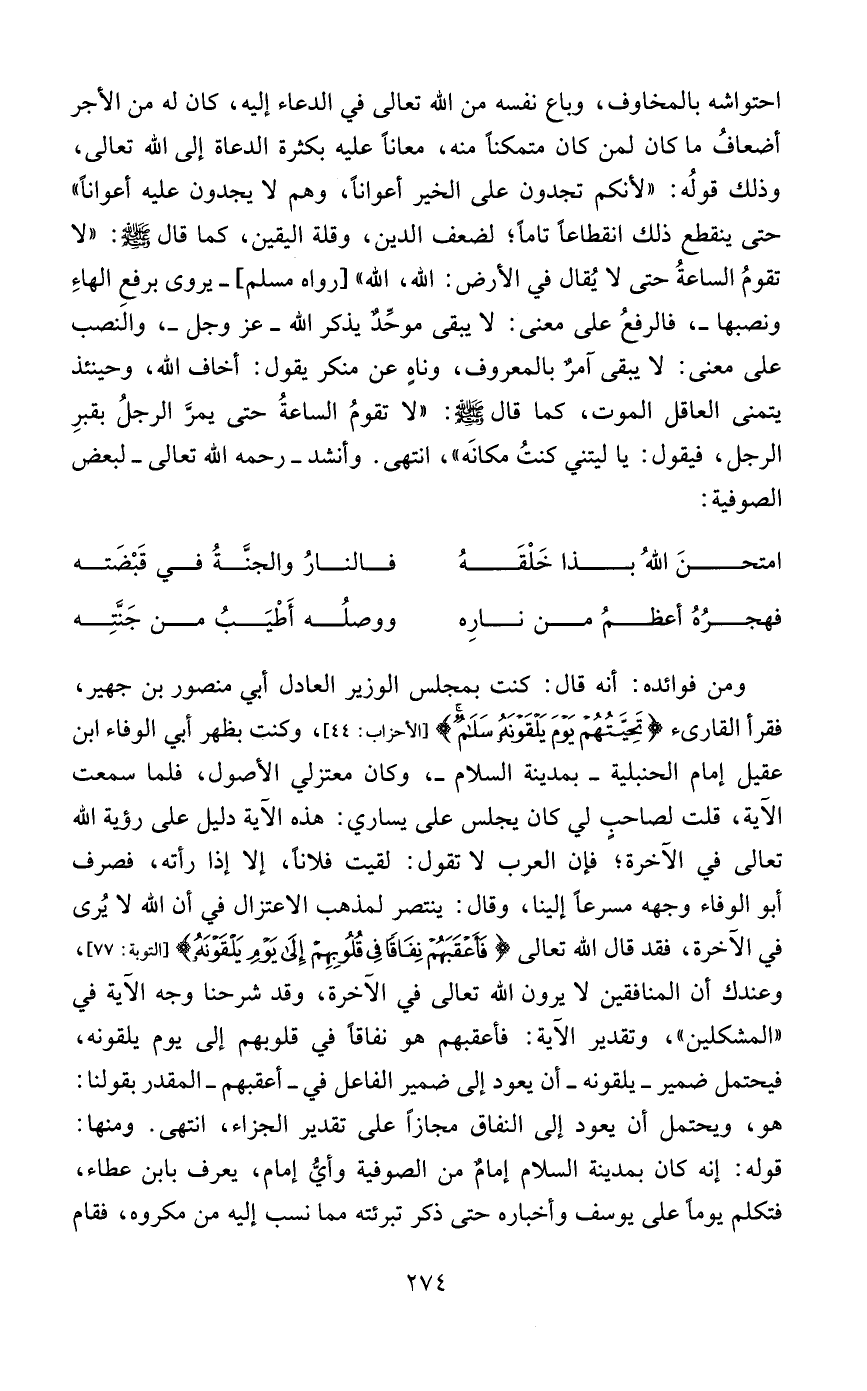 ومن فوائده: أنه قال: كنت بمجلس الوزير العادل أبي منصور بن جهير، فقرأ القارىء {تَحِيَّتُهُمْ يَوْمَ يَلْقَوْنَهُ سَلَامٌ} [الأحزاب: 44]، وكنت بظهر أبي الوفاء ابن عقيل إمام الحنبلية - بمدينة السلام -، وكان معتزلي الأصول، فلما سمعت الآية، قلت لصاحب لي كان يجلس على يساري: هذه الآية دليل على رؤية الله تعالى في الآخرة؛ فإن العرب لا تقول: لقيت فلانًا، إلا إذا رأته، فصرف أبو الوفاء وجهه مسرعًا إلينا، وقال: ينتصر لمذهب الاعتزال في أن الله لا يُرى في الآخرة، فقد قال الله تعالى {فَأَعْقَبَهُمْ نِفَاقًا فِي قُلُوبِهِمْ إِلَى يَوْمِ يَلْقَوْنَهُ} [التوبة: 77]، وعندك أن المنافقين لا يرون الله تعالى في الآخرة، وقد شرحنا وجه الآية في "المشكلين"، وتقدير الآية: فأعقبهم هو نفاقًا في قلوبهم إلى يوم يلقونه، فيحتمل ضمير - يلقونه - أن يعود إلى ضمير الفاعل في - أعقبهم - المقدر بقولنا: هو، ويحتمل أن يعود إلى النفاق مجازًا على تقدير الجزاء، انتهى. ومنها: قوله: إنه كان بمدينة السلام إمامٌ من الصوفية وأيُّ إمام، يعرف بابن عطاء، فتكلم يومًا على يوسف وأخباره حتى ذكر تبرئته مما نسب إليه من مكروه، فقام