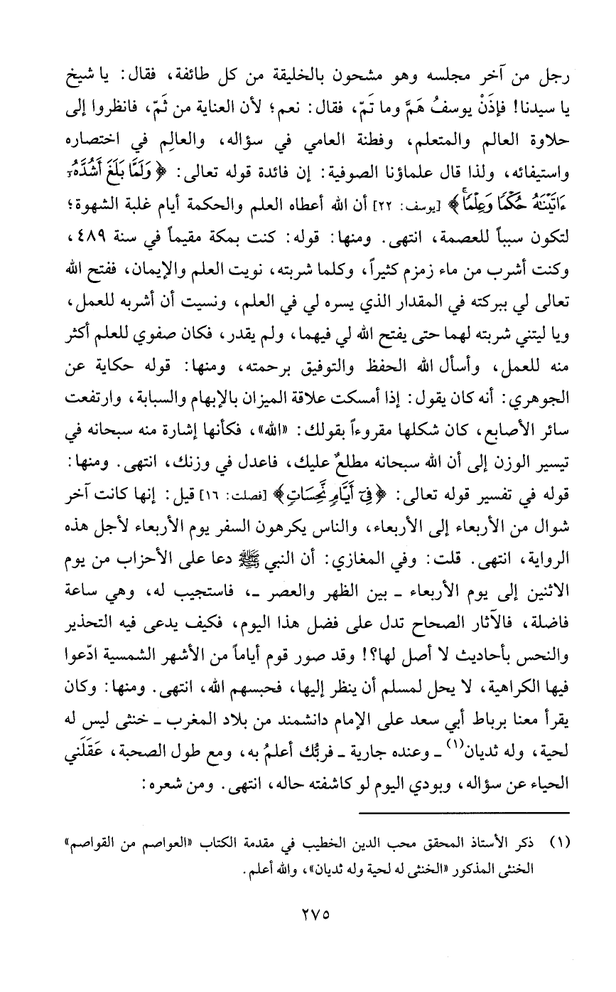 رجل من آخر مجلسه وهو مشحون بالخليقة من كل طائفة، فقال: يا شيخ يا سيدنا! فإذَنْ يوسفُ هَمَّ وما تَمّ، فقال: نعم؛ لأن العناية من ثَمّ، فانظروا إلى حلاوة العالم والمتعلم، وفطنة العامي في سؤاله، والعالِم في اختصاره واستيفائه، ولذا قال علماؤنا الصوفية: إن فائدة قوله تعالى: {لَمَّا بَلَغَ أَشُدَّهُ آتَيْنَاهُ حُكْمًا وَعِلْمًا} [يوسف: 22] أن الله أعطاه العلم والحكمة أيام غلبة الشهوة؛ لتكون سببًا للعصمة، انتهى. ومنها: قوله: كنت بمكة مقيمًا في سنة 489، وكنت أشرب من ماء زمزم كثيرًا، وكلما شربته، نويت العلم والإيمان، ففتح الله تعالى لي ببركته في المقدار الذي يسره لي في العلم، ونسيت أن أشربه للعمل، ويا ليتني شربته لهما حتى يفتح الله لي فيهما، ولم يقدر، فكان صفوي للعلم أكثر منه للعمل، وأسأل الله الحفظ والتوفيق برحمته، ومنها: قوله حكاية عن الجوهري: أنه كان يقول: إذا أمسكت علاقة الميزان بالإبهام والسبابة، وارتفعت سائر الأصابع، كان شكلها مقروءًا بقولك: "الله"، فكأنها إشارة منه سبحانه في تيسير الوزن إلى أن الله سبحانه مطلعٌ عليك، فاعدل في وزنك، انتهى. ومنها: قوله في تفسير قوله تعالى: {فِي أَيَّامٍ نَحِسَاتٍ} [فصلت: 16] قيل: إنها كانت آخر شوال من الأربعاء إلى الأربعاء، والناس يكرهون السفر يوم الأربعاء لأجل هذه الرواية، انتهى. قلت: وفي المغازي: أن النبي - صلى الله عليه وسلم - دعا على الأحزاب من يوم الاثنين إلى يوم الأربعاء - بين الظهر والعصر -، فاستجيب له، وهي ساعة فاضلة، فالآثار الصحاح تدل على فضل هذا اليوم، فكيف يدعى فيه التحذير والنحس بأحاديث لا أصل لها؟! وقد صور قوم أيامًا من الأشهر الشمسية ادّعوا فيها الكراهية، لا يحل لمسلم أن ينظر إليها، فحبسهم الله، انتهى. ومنها: وكان يقرأ معنا برباط أبي سعد على الإمام دانشمند من بلاد المغرب - خنثى ليس له لحية، وله ثديان (¬1) - وعنده جارية - فربُّك أعلمُ به، ومع طول الصحبة، عَقَلَني الحياء عن سؤاله، وبودي اليوم لو كاشفته حاله، انتهى. ومن شعره: