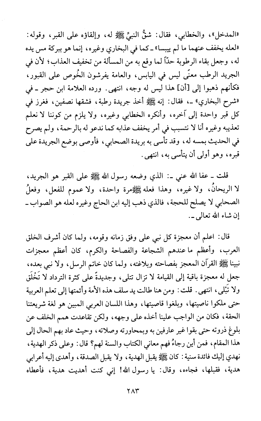 "المدخل"، والخطابي، فقال: شقُّ النبيِّ - صلى الله عليه وسلم - له، وإلقاؤه على القبر، وقوله: "لعله يخفف عنهما ما لم ييبسا" - كما في البخاري وغيره، إنما هو ببركة مس يده له، وجعل بقاء الرطوبة حدًّا لما وقع به من المسألة من تخفيف العذاب؛ لأن في الجريد الرطب معنًى ليس في اليابس، والعامة يفرشون الخُوص على القبور، فكأنهم ذهبوا إلى [أن] هذا ليس له وجه، انتهى. ورده العلامة ابن حجر - في "شرح البخاري" -، فقال: إنه - صلى الله عليه وسلم - أخذ جريدة رطبة، فشقها نصفين، فغرز في كل قبر واحدة إلى آخره، وأنكره الخطابي وغيره، ولا يلزم من كوننا لا نعلم تعذيبه وغيره أنا لا نتسبب في أمر يخفف عذابه كما ندعو له بالرحمة، ولم يصرح في الحديث بمسه له، وقد تأسى به بريدة الصحابي، فأوصى بوضع الجريدة على قبره، وهو أولى أن يتأسى به، انتهى.
