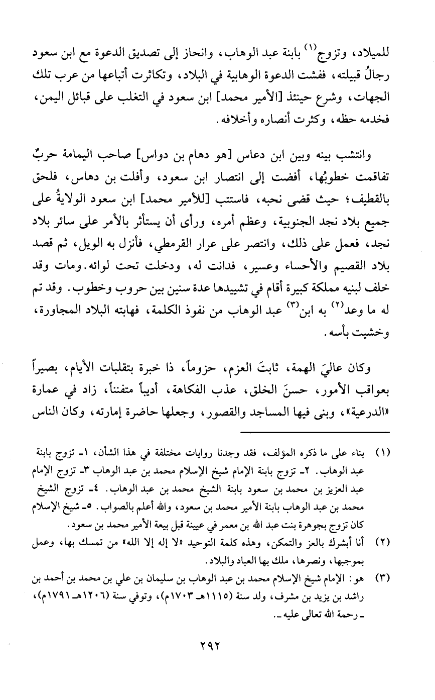 (¬1) بناء على ما ذكره المؤلف، ففد وجدنا روايات مختلفة في هذا الشأن، 1 - تزوج بابنة عبد الوهاب. 2 - تزوج بابنة الإمام شيخ الإسلام محمد بن عبد الوهاب 3 - تزوج الإمام عبد العزيز بن محمد بن سعود بابنة الشيخ محمد بن عبد الوهاب. 4 - تزوج الشيخ محمد بن عبد الوهاب بابنة الأمير محمد بن سعود، والله أعلم بالصواب. 5 - شيخ الإسلام كان تزوج بجوهرة بنت عبد الله بن معمر في عيينة قبل بيعة الأمير محمد بن سعود.