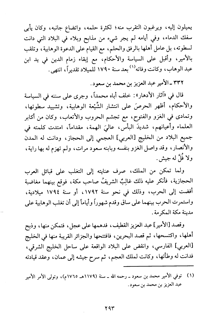يميلون إليه، ويرغبون التقرب منه؛ لكثرة حلمه، واتضاع جانبه، وكان يأبى سفك الدماء، وفي أيامه لم يجر شيء من مذابح وبلاء في البلاد التي دانت لسطوته، بل عامل أهلها بالرفق والحلم، مع القيام على الدعوة الوهابية، وتلقب بالأمير، وأقبل على السياسة والأحكام، مع إبقاء زمام الدين في يد ابن عبد الوهاب، وكانت وفاته (¬1) بعد سنة 1790 للميلاد تقديرًا، انتهى.