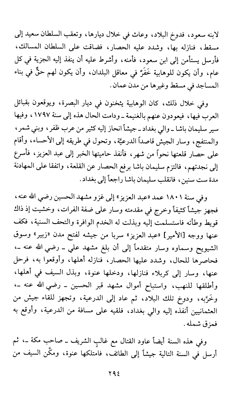 وفي خلال ذلك، كان الوهابية يثخنون في ديار البصرة، ويوقعون بقبائل العرب فيها، فيعودون عنهم بالغنيمة - ودامت الحال هذه إلى سنة 1797، وفيها سير سليمان باشا - والي بغداد - جيشًا انحاز إليه كثير من عرب ظفر، وبني شمر، والمنتفج، وسار الجيش قاصدًا الدرعيَّة، وتحول في طريقه إلى الأحساء، وأقام على حصار قلعتها نحوًا من شهر، فأنفذ حاميتها الخبر إلى عبد العزيز، فأسرع إلى نجدتهم، فالتزم سليمان باشا برفع الحصار عن القلعة، واتفقا على المهادنة مدة ست سنين، فانقلب سليمان باشا راجعًا إلى بغداد.
