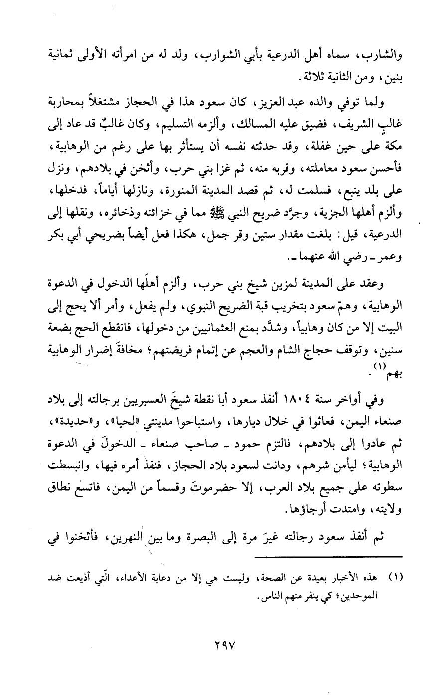 وفي أواخر سنة 1804 أنفذ سعود أبا نقطة شيخَ العسيريين برجالته إلى بلاد صنعاء اليمن، فعاثوا في خلال ديارها، واستباحوا مدينتي "لحيا"، و"حديدة"، ثم عادوا إلى بلادهم، فالتزم حمود - صاحب صنعاء - الدخولَ في الدعوة الوهابية؛ ليأمن شرهم، ودانت لسعود بلاد الحجاز، فنفذ أمره فيها، وانبسطت سطوته على جميع بلاد العرب، إلا حضرموتَ وقسمًا من اليمن، فاتسع نطاق ولايته، وامتدت أرجاؤها.