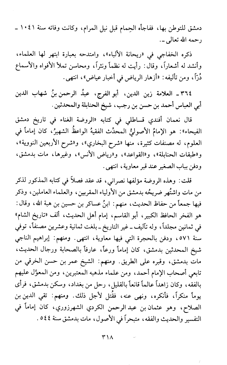 قلت: وهذه الروضة مؤلفها نصراني، قد عقد فصلاً في كتابه المذكور لذكر من مات واشتُهر ضريحُه بدمشق من الأولياء المقربين، والعلماء العاملين، وذكر فيها جمعًا من حفاظ الحديث، منهم: ابنُ عساكر بن حسين بن هبة الله، وقال: هو الفخر الحافظ الكبير، أبو القاسم، إمام أهل الحديث، ألف "تاريخ الشام" في ثمانين مجلدًا، وله تآليف - غير التاريخ - بلغت ثمانية وعشرين مصنفًا، توفي سنة 571، ودفن بالحجرة التي فيها معاوية، انتهى. ومنهم: إبراهيم الناجي شيخ المحدثين بدمشق، كان إمامًا ورعًا، عارفًا بالصحابة ورجال الحديث، مات بدمشق، وقبره على الطريق. ومنهم: الشيخ عمر بن حسن الخرقي من تابعي أصحاب الإمام أحمد، ومن علماء مذهبه المعتبرين، ومن المعوَّل عليهم بالفقه، وكان زاهدًا عالمًا قانعًا بالقليل، رحل من بغداد، وسكن بدمشق، فرأى يومًا منكرًا، فأنكره، ونهى عنه، فقُتل لأجل ذلك. ومنهم: تقي الدين بن الصلاح، وهو عثمان بن عبد الرحمن الكردي الشهرزوري، كان إمامًا في التفسير والحديث والفقه، متبحرًا في الأصول، مات بدمشق سنة 544.