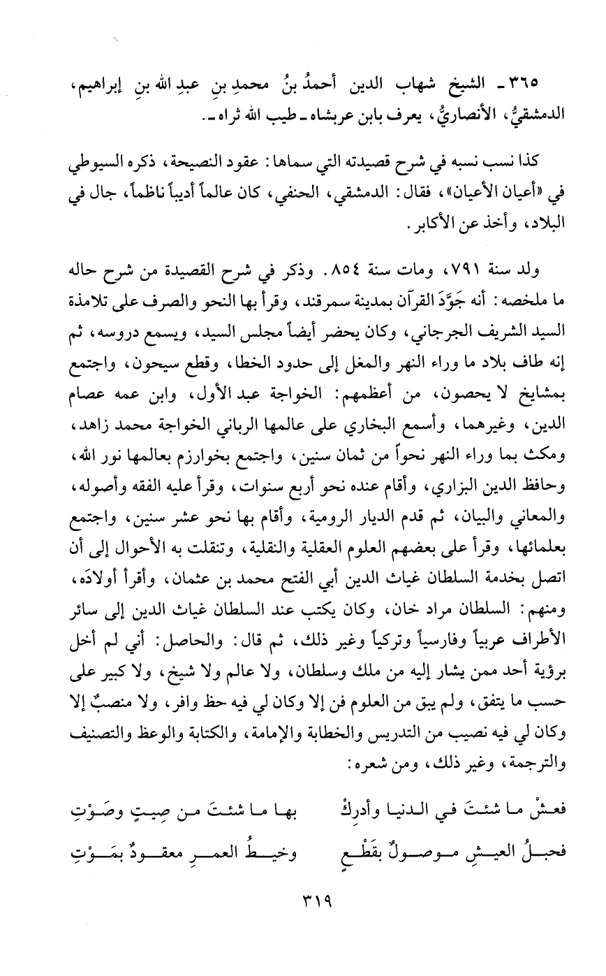 365 - الشيخ شهاب الدين أحمدُ بنُ محمدِ بنِ عبدِ الله بنِ إبراهيم، الدمشقيُّ، الأنصاريُّ، يعرف بابن عربشاه - طيب الله ثراه -.