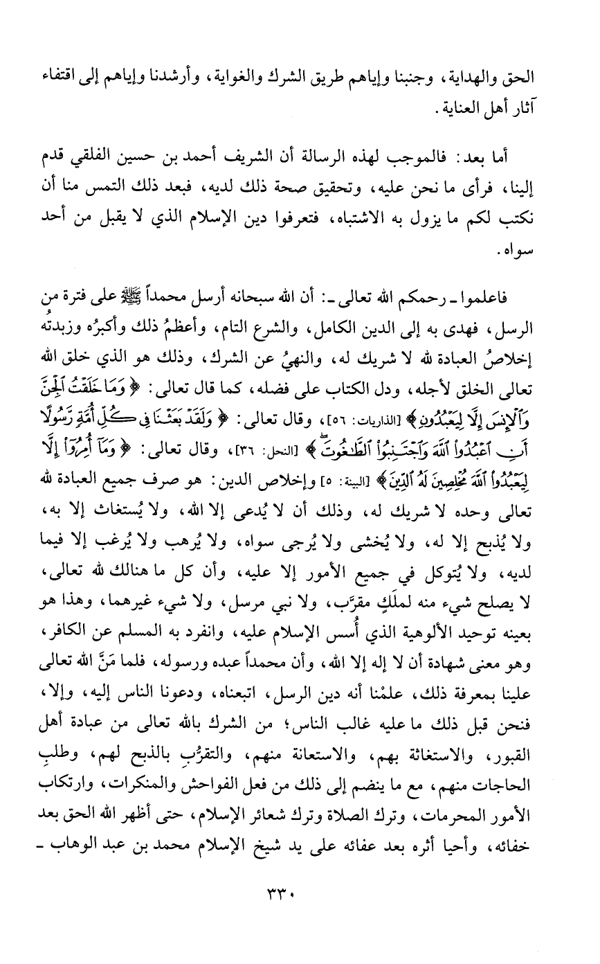أما بعد: فالموجب لهذه الرسالة أن الشريف أحمد بن حسين الفلقي قدم إلينا، فرأى ما نحن عليه، وتحقيق صحة ذلك لديه، فبعد ذلك التمس منا أن نكتب لكم ما يزول به الاشتباه، فتعرفوا دين الإسلام الذي لا يقبل من أحد سواه.