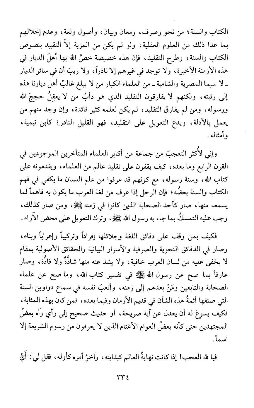 وإني لأُكثر التعجبَ من جماعة من أكابر العلماء المتأخرين الموجودين في القرن الرابع وما بعده، كيف يقفون على تقليد عالم من العلماء، ويقدمونه على كتاب الله، وسنة رسوله، مع كونهم قد عرفوا من علم اللسان ما يكفي في فهم الكتاب والسنة بعضُه؛ فإن الرجل إذا عرف من لغة العرب ما يكون به فاهمًا لما يسمعه منها، صار كأحد الصحابة الذين كانوا في زمنه - صلى الله عليه وسلم -، ومن صار كذلك، وجب عليه التمسكُ بما جاء به رسول الله - صلى الله عليه وسلم -، وترك التعويل على محض الآراء.