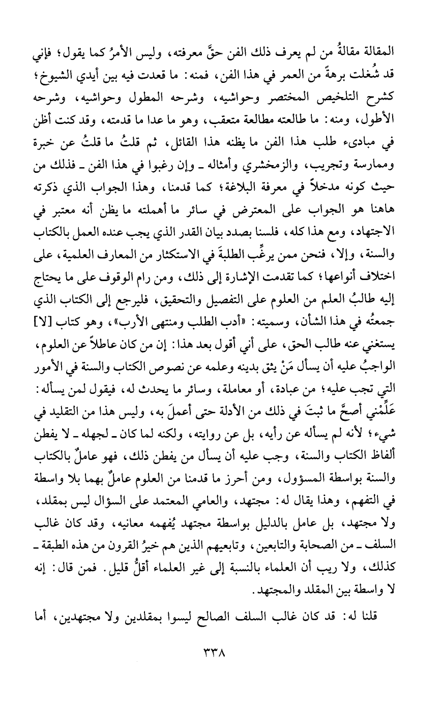 المقالة مقالةُ من لم يعرف ذلك الفن حقَّ معرفته، وليس الأمرُ كما يقول؛ فإني قد شُغلت برهةً من العمر في هذا الفن، فمنه: ما قعدت فيه بين أيدي الشيوخ؛ كشرح التلخيص المختصر وحواشيه، وشرحه المطول وحواشيه، وشرحه الأطول، ومنه: ما طالعته مطالعة متعقب، وهو ما عدا ما قدمته، وقد كنت أظن في مبادىء طلب هذا الفن ما يظنه هذا القائل، ثم قلتُ ما قلتُ عن خبرة وممارسة وتجريب، والزمخشري وأمثاله - وإن رغبوا في هذا الفن - فذلك من حيث كونه مدخلاً في معرفة البلاغة؛ كما قدمنا، وهذا الجواب الذي ذكرته ها هنا هو الجواب على المعترض في سائر ما أهملته ما يظن أنه معتبر في الاجتهاد، ومع هذا كله، فلسنا بصدد بيان القدر الذي يجب عنده العمل بالكتاب والسنة، وإلا، فنحن ممن يرغِّب الطلبةَ في الاستكثار من المعارف العلمية، على اختلاف أنواعها؛ كما تقدمت الإشارة إلى ذلك، ومن رام الوقوف على ما يحتاج إليه طالبُ العلم من العلوم على التفصيل والتحقيق، فليرجع إلى الكتاب الذي جمعتُه في هذا الشأن، وسميته: "أدب الطلب ومنتهى الأرب"، وهو كتاب [لا] يستغني عنه طالب الحق، على أني أقول بعد هذا: إن من كان عاطلاً عن العلوم، الواجبُ عليه أن يسأل مَنْ يثق بدينه وعلمه عن نصوص الكتاب والسنة في الأمور التي تجب عليه؛ من عبادة، أو معاملة، وسائر ما يحدث له، فيقول لمن يسأله: عَلِّمني أصحَّ ما ثبتَ في ذلك من الأدلة حتى أعملَ به، وليس هذا من التقليد في شيء؛ لأنه لم يسأله عن رأيه، بل عن روايته، ولكنه لما كان - لجهله - لا يفطن ألفاظ الكتاب والسنة، وجب عليه أن يسأل من يفطن ذلك، فهو عاملٌ بالكتاب والسنة بواسطة المسؤول، ومن أحرز ما قدمنا من العلوم عامل بهما بلا واسطة في التفهم، وهذا يقال له: مجتهد، والعامي المعتمد على السؤال ليس بمقلد، ولا مجتهد، بل عامل بالدليل بواسطة مجتهد يُفهمه معانيه، وقد كان غالب السلف - من الصحابة والتابعين، وتابعيهم الذين هم خيرُ القرون من هذه الطبقة - كذلك، ولا ريب أن العلماء بالنسبة إلى غير العلماء أقلُّ قليل. فمن قال: إنه لا واسطة بين المقلد والمجتهد.