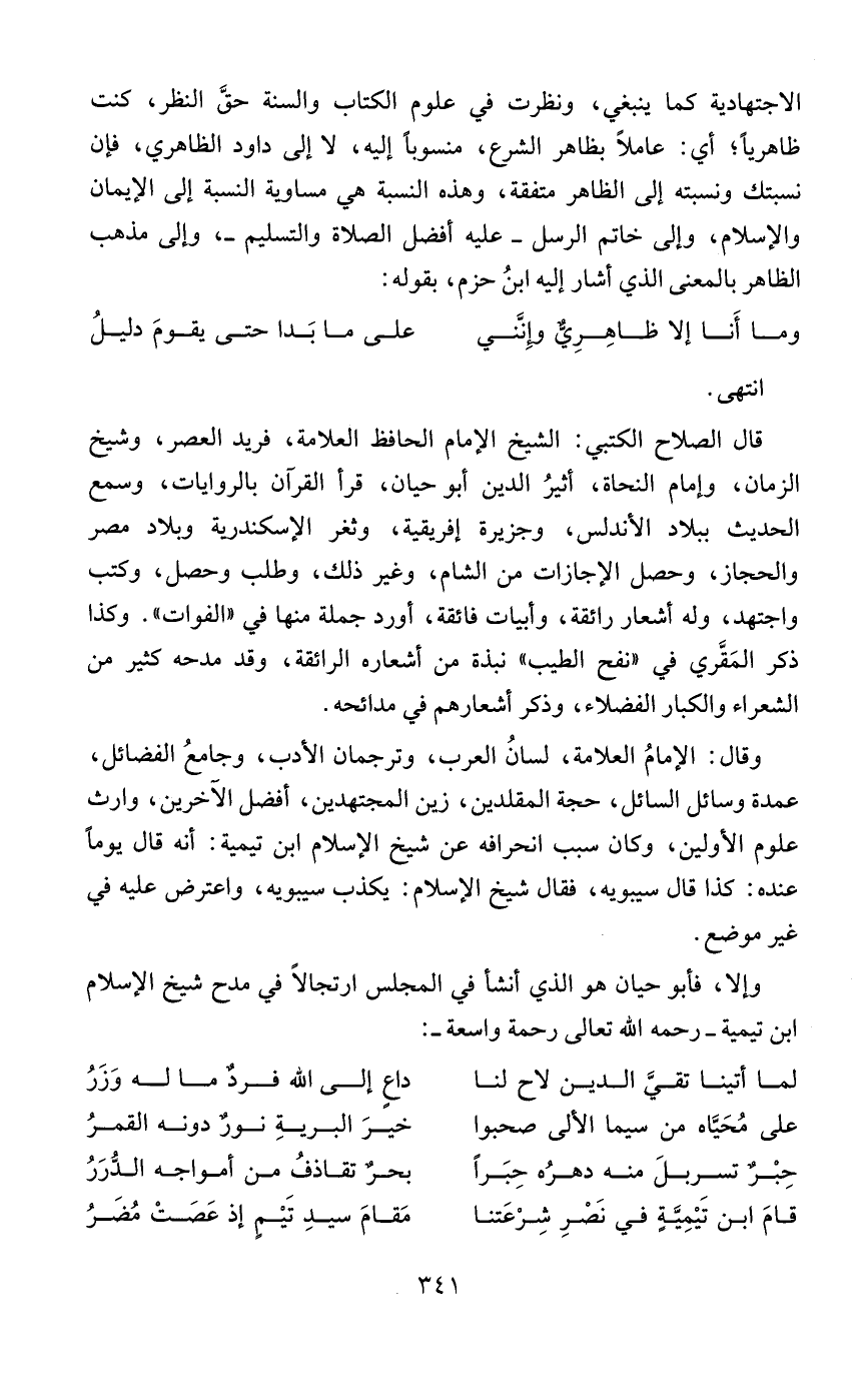 وإلا، فأبو حيان هو الذي أنشأ في المجلس ارتجالاً في مدح شيخ الإسلام ابن تيمية - رحمه الله تعالى رحمة واسعة -: