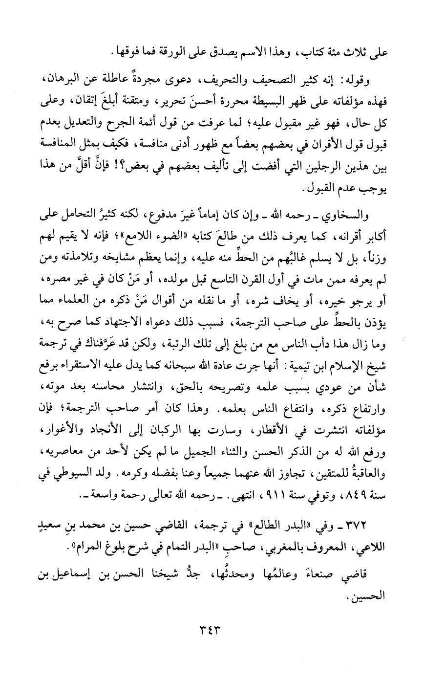 372 - وفي "البدر الطالع" في ترجمة، القاضي حسين بن محمد بنِ سعيدٍ اللاعي، المعروف بالمغربي، صاحبِ "البدر التمام في شرح بلوغ المرام".