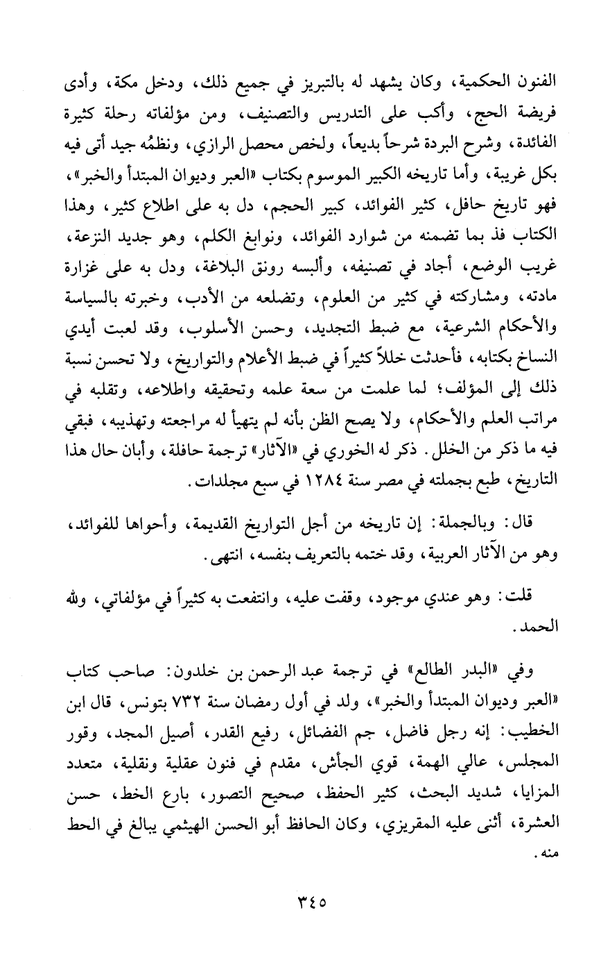 الفنون الحكمية، وكان يشهد له بالتبريز في جميع ذلك، ودخل مكة، وأدى فريضة الحج، وأكب على التدريس والتصنيف، ومن مؤلفاته رحلة كثيرة الفائدة، وشرح البردة شرحًا بديعًا، ولخص محصل الرازي، ونظمُه جيد أتى فيه بكل غريبة، وأما تاريخه الكبير الموسوم بكتاب "العبر وديوان المبتدأ والخبر"، فهو تاريخ حافل، كثير الفوائد، كبير الحجم، دل به على اطلاع كثير، وهذا الكتاب فذ بما تضمنه من شوارد الفوائد، ونوابغ الكلم، وهو جديد النزعة، غريب الوضع، أجاد في تصنيفه، وألبسه رونق البلاغة، ودل به على غزارة مادته، ومشاركته في كثير من العلوم، وتضلعه من الأدب، وخبرته بالسياسة والأحكام الشرعية، مع ضبط التجديد، وحسن الأسلوب، وقد لعبت أيدي النساخ بكتابه، فأحدثت خللاً كثيرًا في ضبط الأعلام والتواريخ، ولا تحسن نسبة ذلك إلى المؤلف؛ لما علمت من سعة علمه وتحقيقه واطلاعه، وتقلبه في مراتب العلم والأحكام، ولا يصح الظن بأنه لم يتهيأ له مراجعته وتهذيبه، فبقي فيه ما ذكر من الخلل. ذكر له الخوري في "الآثار" ترجمة حافلة، وأبان حال هذا التاريخ، طبع بجملته في مصر سنة 1284 في سبع مجلدات.