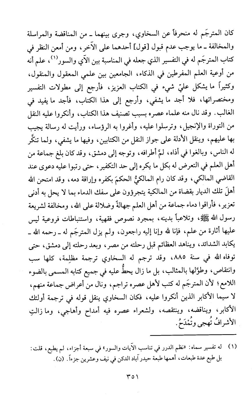 كان المترجَم له منحرفًا عن السخاوي، وجرى بينهما - من المناقضة والمراسلة والمخالفة - ما يوجب عدم قبول [قول] أحدهما على الآخر، ومن أمعن النظر في كتاب المترجَم له في التفسير الذي جعله في المناسبة بين الآي والسور (¬1)، علم أنه من أوعية العلم المفرطين في الذكاء، الجامعين بين علمي المعقول والمنقول، وكثيرًا ما يشكل عليّ شيء في الكتاب العزيز، فأرجع إلى مطولات التفسير ومختصراتها، فلا أجد ما يشفي، وأرجع إلى هذا الكتاب، فأجد ما يفيد في الغالب. وقد نال منه علماء عصره بسبب تصنيف هذا الكتاب، وأنكروا عليه النقل من التوراة والإنجيل، وترسلوا عليه، وأغروا به الرؤساء، ورأيت له رسالة يجيب بها عليهم، وينقل الأدلة على جواز النقل من الكتابين، وفيها ما يشفي، ولما تنكَّر له الناس، وبالغوا في أذاه، لمَّ أطرافه، وتوجه إلى دمشق، وقد كان بلغ جماعة من أهل العلم في التعرض له بكل ما يكره إلى حد التكفير، حتى رتبوا عليه دعوى عند القاضي المالكي، وقد كان رام المالكيُّ الحكمَ بكفره وإراقة دمه، وقد امتحن الله أهلَ تلك الديار بقضاة من المالكية يتجرؤون على سفك الدماء بما لا يحل به أدنى تعزير، فأراقوا دماء جماعة من أهل العلم جهالةً وضلالة على الله، ومخالفة لشريعة رسول الله - صلى الله عليه وسلم -، وتلاعبًا بدينه، بمجرد نصوص فقهية، واستنباطات فروعية ليس عليها أثارة من علم، فإنا لله وإنا إليه راجعون، ولم يزل المترجَم له - رحمه الله - يكابد الشدائد، ويناهد العظائم قبل رحلته من مصر، وبعد رحلته إلى دمشق، حتى توفاه الله في سنة 885، وقد ترجم له السخاوي ترجمة مظلِمة، كلها سب وانتقاص، وطوَّلها بالمثالب، بل ما زال يحطُّ عليه في جميع كتابه المسمى بالضوء اللامع؛ لأن المترجَم له كتب لأهل عصره تراجم، ونال من أعراض جماعة منهم، لا سيما الأكابر الذين أنكروا عليه، فكان السخاوي ينقل قوله في ترجمة أولئك الأكابر، ويناقضه، وينتقصه، ولشعراء عصره فيه أمداح وأهاجي، وما زالتِ الأشرافُ تُهجى وتُمْدَحُ.
