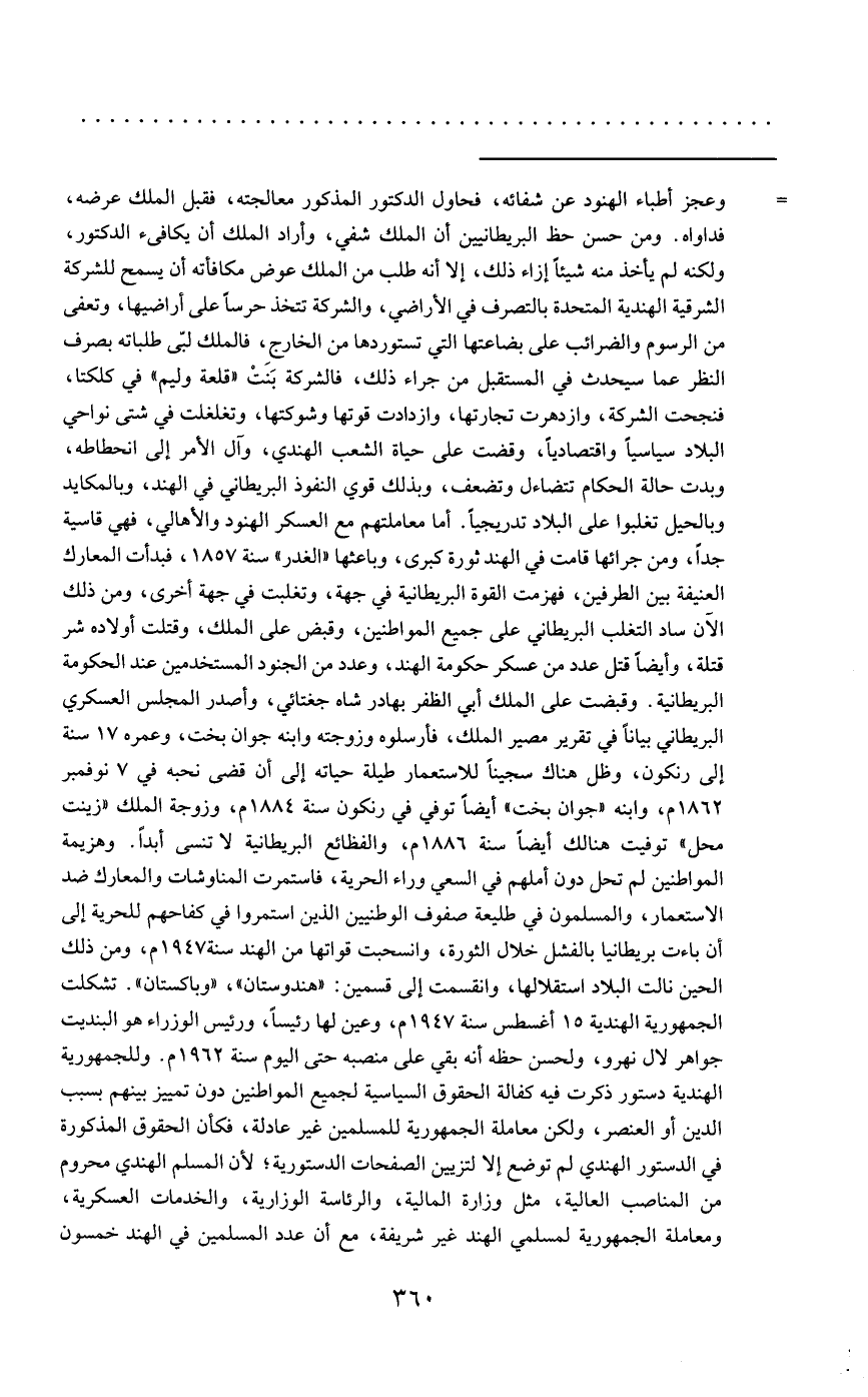 = وعجز أطباء الهنود عن شفائه، فحاول الدكتور المذكور معالجته، فقبل الملك عرضه، فداواه. ومن حسن حظ البريطانيين أن الملك شفي، وأراد الملك أن يكافيء الدكتور، ولكنه لم يأخذ منه شيئًا إزاء ذلك، إلا أنه طلب من الملك عوض مكافأته أن يسمح للشركة الشرقية الهندية المتحدة بالتصرف في الأراضي، والشركة تتخذ حرسًا على أراضيها، وتعفى من الرسوم والضرائب على بضاعتها التي تستوردها من الخارج، فالملك لبّى طلباته بصرف النظر عما سيحدث في المستقبل من جراء ذلك، فالشركة بَنَتْ "قلعة وليم" في كلكتا، فنجحت الشركة، وازدهرت تجارتها، وازدادت قوتها وشوكتها، وتغلغلت في شتى نواحي البلاد سياسيًا واقتصاديًا، وقضت على حياة الشعب الهندي، وآل الأمر إلى انحطاطه، وبدت حالة الحكام تتضاءل وتضعف، وبذلك قوي النفوذ البريطاني في الهند، وبالمكايد وبالحيل تغلبوا على البلاد تدريجيًا. أما معاملتهم مع العسكر الهنود والأهالي، فهي قاسية جدًا، ومن جرائها قامت في الهند ثورة كبرى، وباعثها "الغدر" سنة 1857، فبدأت المعارك العنيفة بين الطرفين، فهزمت القوة البريطانية في جهة، وتغلبت في جهة أخرى، ومن ذلك الآن ساد التغلب البريطاني على جميع المواطنين، وقبض على الملك، وقتلت أولاده شر قتلة، وأيضًا قتل عدد من عسكر حكومة الهند، وعدد من الجنود المستخدمين عند الحكومة البريطانية. وقبضت على الملك أبي الظفر بهادر شاه جغتائي، وأصدر المجلس العسكري البريطاني بيانًا في تقرير مصير الملك، فأرسلوه وزوجته وابنه جوان بخت، وعمره 17 سنة إلى رنكون، وظل هناك سجينًا للاستعمار طيلة حياته إلى أن قضى نحبه في 7 نوفمبر 1862 م، وابنه "جوان بخت" أيضًا توفي في رنكون سنة 1884 م، وزوجة الملك "زينت محل" توفيت هنالك أيضًا سنة 1886 م، والفظائع البريطانية لا تنسى أبدًا. وهزيمة المواطنين لم تحل دون أملهم في السعي وراء الحرية، فاستمرت المناوشات والمعارك ضد الاستعمار، والمسلمون في طليعة صفوف الوطنيين الذين استمروا في كفاحهم للحرية إلى أن باءت بريطانيا بالفشل خلال الثورة، وانسحبت قواتها من الهند سنة 1947 م، ومن ذلك الحين نالت البلاد استقلالها، وانقسمت إلى قسمين: "هندوستان"، "وباكستان". تشكلت الجمهورية الهندية 15 أغسطس سنة 1947 م، وعين لها رئيسًا، ورئيس الوزراء هو البنديت جواهر لال نهرو، ولحسن حظه أنه بقي على منصبه حتى اليوم سنة 1962 م. وللجمهورية الهندية دستور ذكرت فيه كفالة الحقوق السياسية لجميع المواطنين دون تمييز بينهم بسبب الدين أو العنصر، ولكن معاملة الجمهورية للمسلمين غير عادلة، فكأن الحقوق المذكورة في الدستور الهندي لم توضع إلا لتزيين الصفحات الدستورية؛ لأن المسلم الهندي محروم من المناصب العالية، مثل وزارة المالية، والرئاسة الوزارية، والخدمات العسكرية، ومعاملة الجمهورية لمسلمي الهند غير شريفة، مع أن عدد المسلمين في الهند خمسون