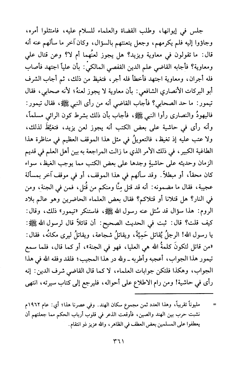 جلس في إيوانها، وطلب القضاة والعلماء للسلام عليه، فامتثلوا أمره، وجاؤوا إليه فلم يكرمهم، وجعل يتعنتهم بالسؤال، وكان آخر ما سألهم عنه أنه قال: ما تقولون في معاوية ويزيد؟ هل يجوز لعنُهما أم لا؟ وعن قتال علي ومعاوية؟ فأجابه القاضي علم الدين القفصي المالكي: بأن عليًا اجتهد فأصاب فله أجران، ومعاوية اجتهد فأخطأ فله أجر، فتغيظ من ذلك، ثم أجاب الشرف أبو البركات الأنصاري الشافعي: بأن معاوية لا يجوز لعنهُ؛ لأنه صحابي، فقال تيمور: ما حد الصحابي؟ فأجاب القاضي أنه من رأى النبي - صلى الله عليه وسلم -، فقال تيمور: فاليهودُ والنصارى رأوا النبي - صلى الله عليه وسلم -، فأجاب بأن ذلك بشرط كون الرائي مسلمًا، وأنه رأى في حاشية على بعض الكتب أنه يجوز لعن يزيد، فتغيَّظَ لذلك، ولا عتب عليه إذ تغيظ، فالتعويلُ في مثل هذا الموقف العظيم في مناظرة هذا الطاغية الكبير، في ذلك الأمر الذي ما زالت المراجعة به بين أهل العلم في قديم الزمان وحديثه على حاشيةٍ وجدها على بعض الكتب مما يوجب الغيظ، سواء كان محقًا، أو مبطلاً. وقد سألهم في هذا الموقف، أو في موقف آخر بمسألة عجيبة، فقال ما مضمونه: أنه قد قتل مِنَّا ومنكم من قُتل، فمن في الجنة، ومن في النار؟ هل قتلانا أو قتلاكم؟ فقال بعض العلماء الحاضرين وهو عالم بلاد الروم: هذا سؤال قد سُئل عنه رسول الله - صلى الله عليه وسلم -، فاستنكر "تيمور" ذلك، وقال: كيف قلت؟ قال: ثبت في الحديث الصحيح: أن قائلاً قال لرسول الله - صلى الله عليه وسلم -: يا رسول الله! الرجلُ يُقاتل حَمِيَّةً، ويقاتلُ شجاعة، ويقاتلُ ليرى مكانُه، فقال: "من قاتل لتكونَ كلمةُ الله هي العليا، فهو في الجنة"، أو كما قال، فلما سمع تيمور هذا الجواب، أعجبه وأطربه - ولله در هذا المجيب؛ فلقد وفقه الله في هذا الجواب، وهكذا فلتكن جوابات العلماء، لا كما قال القاضي شرف الدين: إنه رأى في حاشية! ومن رام الاطلاع على أحواله، فليرجع إلى كتاب سيرته، انتهى
