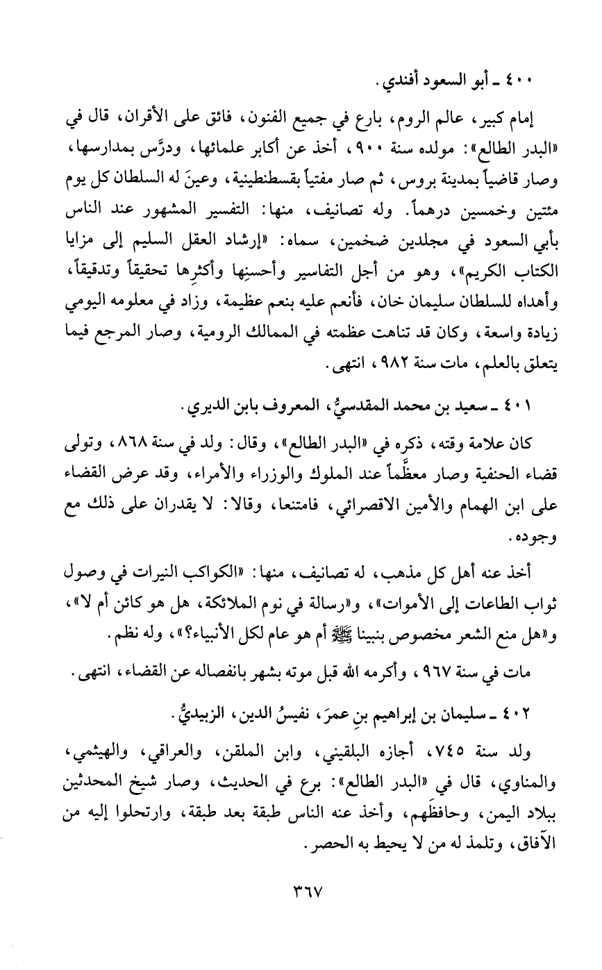 إمام كبير، عالم الروم، بارع في جميع الفنون، فائق على الأقران، قال في "البدر الطالع": مولده سنة 900، أخذ عن أكابر علمائها، ودرَّس بمدارسها، وصار قاضيًا بمدينة بروس، ثم صار مفتيًا بقسطنطينية، وعينَ له السلطان كل يوم مئتين وخمسين درهمًا. وله تصانيف، منها: التفسير المشهور عند الناس بأبي السعود في مجلدين ضخمين، سماه: "إرشاد العقل السليم إلى مزايا الكتاب الكريم"، وهو من أجل التفاسير وأحسنِها واكثرِها تحقيقًا وتدقيقًا، وأهداه للسلطان سليمان خان، فأنعم عليه بنعم عظيمة، وزاد في معلومه اليومي زيادة واسعة، وكان قد تناهت عظمته في الممالك الرومية، وصار المرجع فيما يتعلق بالعلم، مات سنة 982، انتهى.