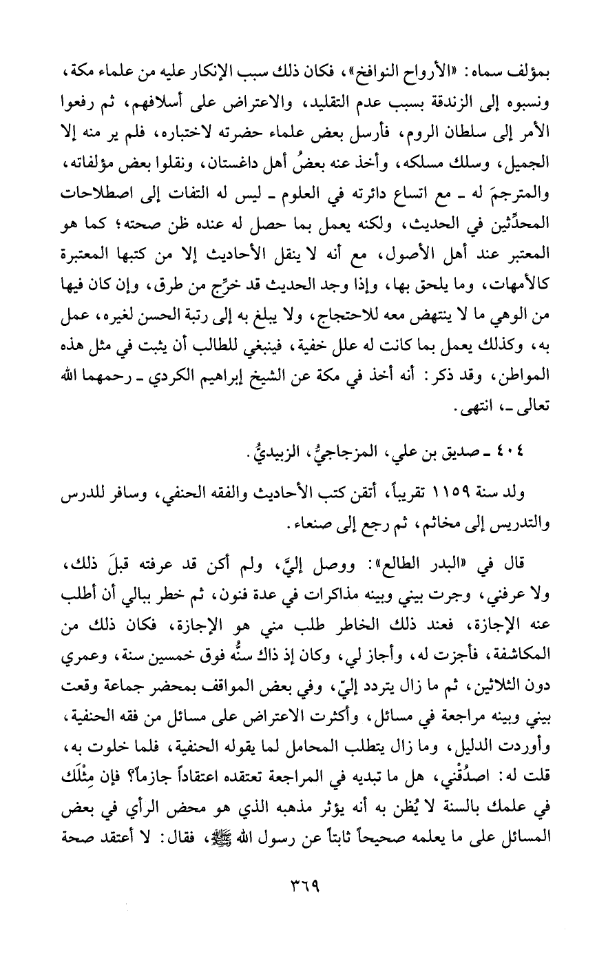 بمؤلف سماه: "الأرواح النوافخ"، فكان ذلك سبب الإنكار عليه من علماء مكة، ونسبوه إلى الزندقة بسبب عدم التقليد، والاعتراض على أسلافهم، ثم رفعوا الأمر إلى سلطان الروم، فأرسل بعض علماء حضرته لاختباره، فلم ير منه إلا الجميل، وسلك مسلكه، وأخذ عنه بعضُ أهل داغستان، ونقلوا بعض مؤلفاته، والمترجمَ له - مع اتساع دائرته في العلوم - ليس له التفات إلى اصطلاحات المحدَّثين في الحديث، ولكنه يعمل بما حصل له عنده ظن صحته؛ كما هو المعتبر عند أهل الأصول، مع أنه لا ينقل الأحاديث إلا من كتبها المعتبرة كالأمهات، وما يلحق بها، وإذا وجد الحديث قد خرِّج من طرق، وإن كان فيها من الوهي ما لا ينتهض معه للاحتجاج، ولا يبلغ به إلى رتبة الحسن لغيره، عمل به، وكذلك يعمل بما كانت له علل خفية، فينبغي للطالب أن يثبت في مثل هذه المواطن، وقد ذكر: أنه أخذ في مكة عن الشيخ إبراهيم الكردي - رحمهما الله تعالى -، انتهى.