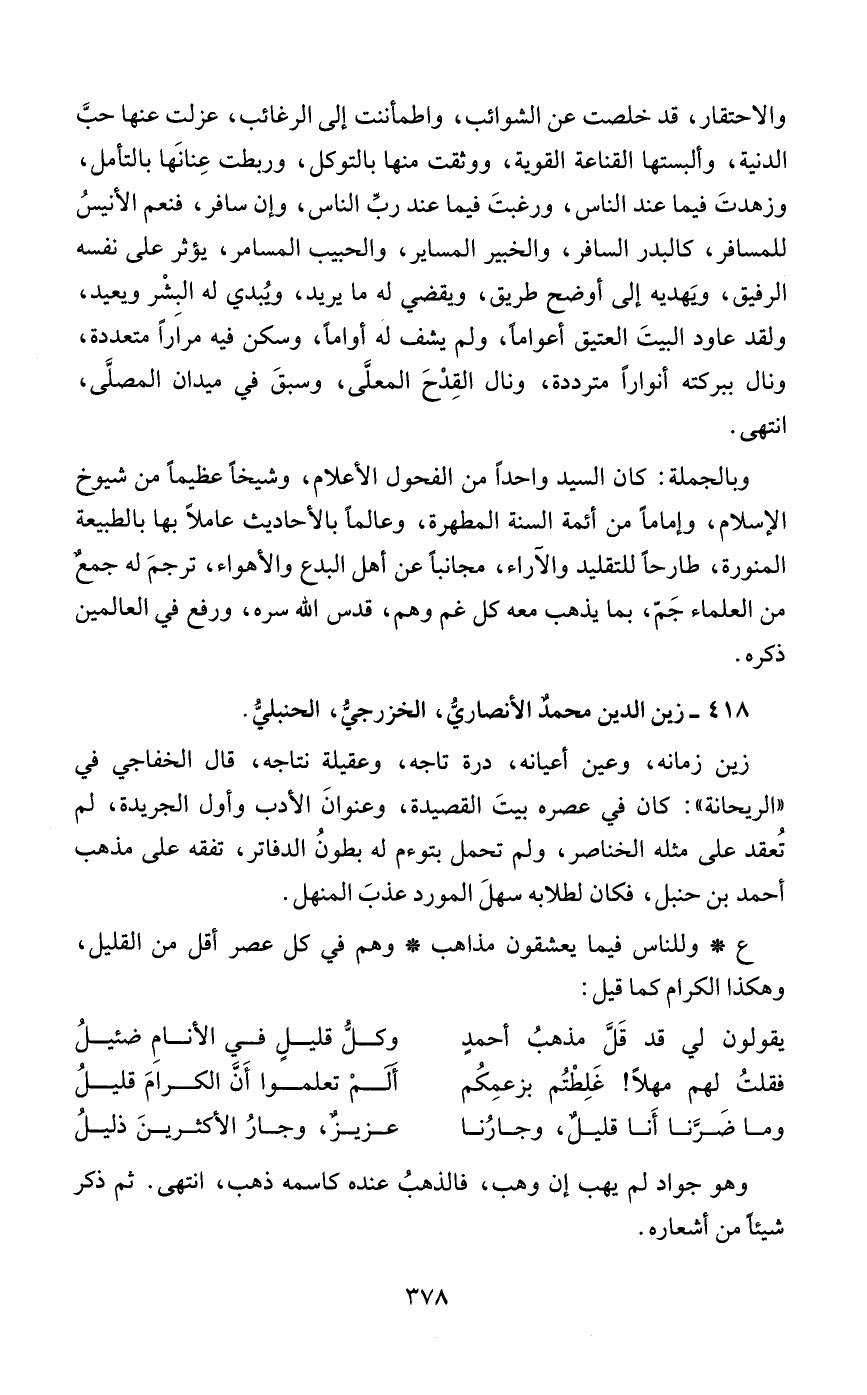 والاحتقار، قد خلصت عن الشوائب، واطمأننت إلى الرغائب، عزلت عنها حبَّ الدنية، وألبستها القناعة القوية، ووثقت منها بالتوكل، وربطت عِنانَها بالتأمل، وزهدتَ فيما عند الناس، ورغبتَ فيما عند ربِّ الناس، وإن سافر، فنعم الأنيسُ للمسافر، كالبدر السافر، والخبير المساير، والحبيب المسامر، يؤثر على نفسه الرفيق، ويَهديه إلى أوضح طريق، ويقضي له ما يريد، ويُبدي له البِشْر ويعيد، ولقد عاود البيتَ العتيق أعوامًا، ولم يشف له أوامًا، وسكن فيه مرارًا متعددة، ونال ببركته أنوارًا مترددة، ونال القِدْحَ المعلَّى، وسبقَ في ميدان المصلَّى، انتهى.
