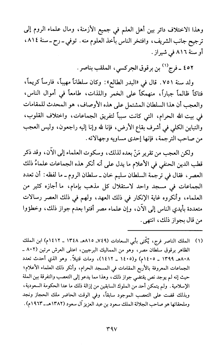 (¬1) الملك الناصر فرج، يُكْنى بأبي السعادات (749 - 815 هـ 1348 - 1412 م) ابن الملك الظاهر برقوق سلطان مصر، وهو من المماليك البرجيين، اعتلى العرش مرتين (802 - 808 هـ 1399 - 1405 م) و (1405 - 1412)، ومات قتيلاً. وهو الذي أحدث تعدد الجماعات المعروفة بالأربع المقامات في المسجد الحرام، وأنكر ذلك العلماء الأعلام؛ حيث إنه لم يوجد نص يقتضي جواز ذلك، وهذا مما يدعو إلى التعصب والتفرقة بين الملة الإسلامية. ولم يتمكن أحد من الملوك السابقين من إزالة ذلك ما عدا الحكومة السعودية، وبذلك قضت على التعصب الموجود سابقًا، وفي الوقت الحاضر ملك الحجاز ونجد وملحقاتها هو صاحب الجلالة الملك سعود بن عبد العزيز آل سعود (1382 هـ - 1963 م).