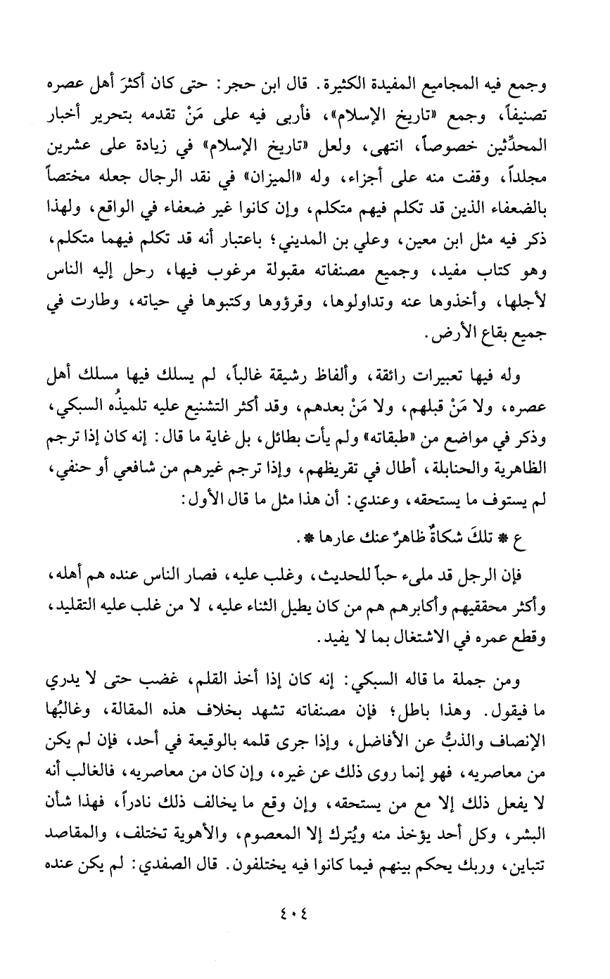 ومن جملة ما قاله السبكي: إنه كان إذا أخذ القلم، غضب حتى لا يدري ما فيقول. وهذا باطل؛ فإن مصنفاته تشهد بخلاف هذه المقالة، وغالبُها الإنصاف والذبُّ عن الأفاضل، وإذا جرى قلمه بالوقيعة في أحد، فإن لم يكن من معاصريه، فهو إنما روى ذلك عن غيره، وإن كان من معاصريه، فالغالب أنه لا يفعل ذلك إلا مع من يستحقه، وإن وقع ما يخالف ذلك نادرًا، فهذا شأن البشر، وكل أحد يؤخذ منه ويُترك إلا المعصوم، والأهوية تختلف، والمقاصد تتباين، وربك يحكم بينهم فيما كانوا فيه يختلفون. قال الصفدي: لم يكن عنده