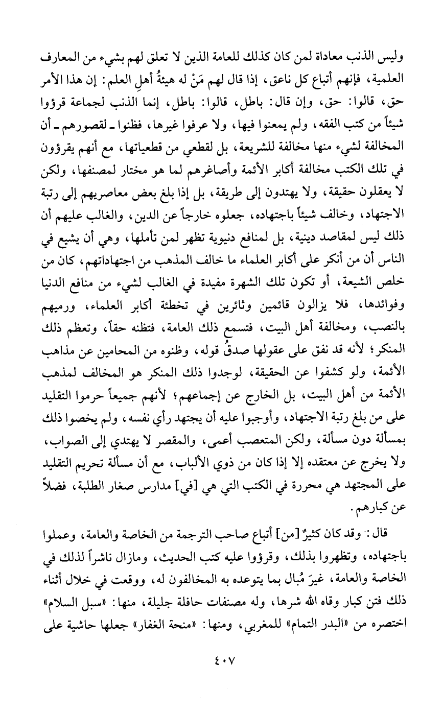 وليس الذنب معاداة لمن كان كذلك للعامة الذين لا تعلق لهم بشيء من المعارف العلمية، فإنهم أتباع كل ناعق، إذا قال لهم مَنْ له هيئةُ أهلِ العلم: إن هذا الأمر حق، قالوا: حق، وإن قال: باطل، قالوا: باطل، إنما الذنب لجماعة قرؤوا شيئًا من كتب الفقه، ولم يمعنوا فيها، ولا عرفوا غيرها، فظنوا - لقصورهم - أن المخالفة لشيء منها مخالفة للشريعة، بل لقطعي من قطعياتها، مع أنهم يقرؤون في تلك الكتب مخالفة أكابر الأئمة وأصاغرهم لما هو مختار لمصنفها، ولكن لا يعقلون حقيقة، ولا يهتدون إلى طريقة، بل إذا بلغ بعض معاصريهم إلى رتبة الاجتهاد، وخالف شيئًا باجتهاده، جعلوه خارجًا عن الدين، والغالب عليهم أن ذلك ليس لمقاصد دينية، بل لمنافع دنيوية تظهر لمن تأملها، وهي أن يشيع في الناس أن من أنكر على أكابر العلماء ما خالف المذهب من اجتهاداتهم، كان من خلص الشيعة، أو تكون تلك الشهرة مفيدة في الغالب لشيء من منافع الدنيا وفوائدها، فلا يزالون قائمين وثائرين في تخطئة أكابر العلماء، ورميهم بالنصب، ومخالفة أهل البيت، فتسمع ذلك العامة، فتظنه حقًا، وتعظم ذلك المنكر؛ لأنه قد نفق على عقولها صدقُ قوله، وظنوه من المحامين عن مذاهب الأئمة، ولو كشفوا عن الحقيقة، لوجدوا ذلك المنكر هو المخالف لمذهب الأئمة من أهل البيت، بل الخارج عن إجماعهم؛ لأنهم جميعًا حرموا التقليد على من بلغ رتبة الاجتهاد، وأوجبوا عليه أن يجتهد رأي نفسه، ولم يخصوا ذلك بمسألة دون مسألة، ولكن المتعصب أعمى، والمقصر لا يهتدي إلى الصواب، ولا يخرج عن معتقده إلا إذا كان من ذوي الألباب، مع أن مسألة تحريم التقليد على المجتهد هي محررة في الكتب التي هي [في] مدارس صغار الطلبة، فضلاً عن كبارهم.