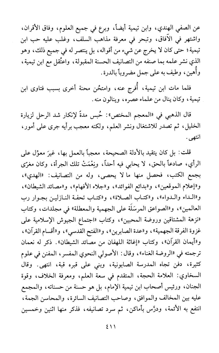 قلت: بل كان يتقيد بالأدلة الصحيحة، معجبًا بالعمل بها، غيرَ معوِّل على الرأي، صادعًا بالحق، لا يحابي فيه أحدًا، ونعمَتْ تلك الجرأة، وكان مغرًى بجمع الكتب، فحصل منها ما لا يحصى، وله من التصانيف: "الهدي"، و"إعلام الموقعين"، و"بدائع الفوائد"، و"جلاء الأفهام"، و"مصائد الشيطان"، و"الداء والدواء"، و"كتاب الصلاة"، و"كتاب تحفة النازلين بجوار رب العالمين"، و"الصواعق المرسَلَة على الجهمية والمعطلة" في مجلدات، وكتاب "نزهة المشتاقين وروضة المحبين"، وكتاب "اجتماع الجيوش الإسلامية على غزوة الفرقة الجهمية"، و"عدة الصابرين"، و"الفتح القدسي"، و"أقسام القرآن"، و"أيمان القرآن"، وكتاب "إغاثة اللهفان من مصائد الشيطان". ذكر له نعمان ترجمته في "الروضة الغناء"، وقال: الأصولي النحوي المفسر، المفنن في علوم كثيرة، دفن تجاه المدرسة الصابونية، وبني على قبره قبة، انتهى. وقال السخاوي: العلامة الحجة، المتقدم في سعة العلم، ومعرفة الخلاف، وقوة الجنان، ورئيس أصحاب ابن تيمية الإمام، بل هو حسنة من حسناته، والمجمع عليه بين المخالف والموافق، وصاحب التصانيف السائرة، والمحاسن الجمة، انتفع به الأئمة، ودرَّس بأماكن، ثم سرد تصانيفه، فذكر منها اثنين وخمسين