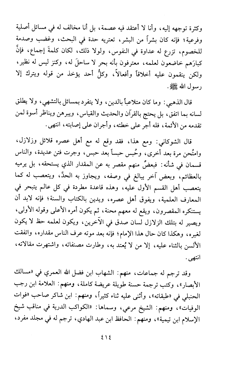 وكثرة توجهه إليه، وأنا لا أعتقد فيه عصمة، بل أنا مخالف له في مسائل أصلية وفرعية؛ فإنه كان بشرًا من البشر، تعتريه حدة في البحث، وغضب وصدمة للخصوم، تزرع له عداوة في النفوس، ولولا ذلك، لكان كلمةَ إجماع، فإنَّ كبارَهم خاضعون لعلمه، معترفون بأنه بكر لا ساحلَ له، وكنز ليس له نظير، ولكن ينقمون عليه أخلاقًا وأفعالاً، وكلُّ أحد يؤخذ من قوله ويترك إلا رسول الله - صلى الله عليه وسلم -.