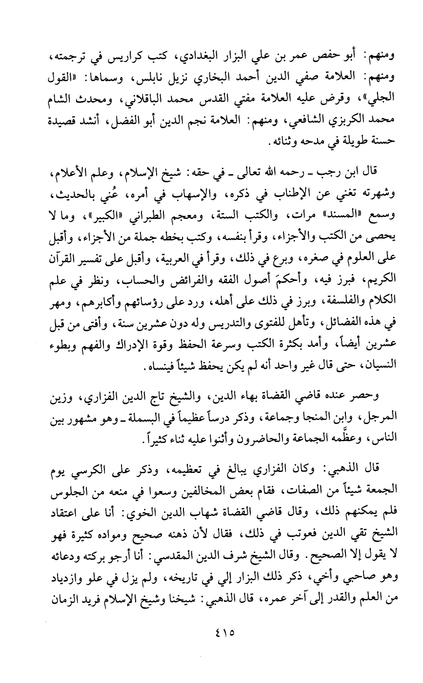 قال ابن رجب - رحمه الله تعالى - في حقه: شيخ الإسلام، وعلم الأعلام، وشهرته تغني عن الإطناب في ذكره، والإسهاب في أمره، عُني بالحديث، وسمع "المسند" مرات، والكتب الستة، ومعجم الطبراني "الكبير"، وما لا يحصى من الكتب والأجزاء، وقرأ بنفسه، وكتب بخطه جملة من الأجزاء، وأقبل على العلوم في صغره، وبرع في ذلك، وقرأ في العربية، وأقبل على تفسير القرآن الكريم، فبرز فيه، وأحكمَ أصول الفقه والفرائض والحساب، ونظر في علم الكلام والفلسفة، وبرز في ذلك على أهله، ورد على رؤسائهم وأكابرهم، ومهر في هذه الفضائل، وتأهل للفتوى والتدريس وله دون عشرين سنة، وأفتى من قبل عشرين أيضًا، وأمد بكثرة الكتب وسرعة الحفظ وقوة الإدراك والفهم وبطوء النسيان، حتى قال غير واحد أنه لم يكن يحفظ شيئًا فينساه.