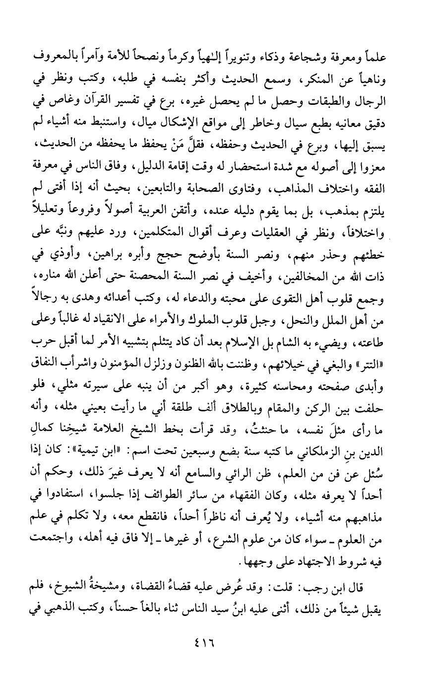 علمًا ومعرفة وشجاعة وذكاء وتنويرًا إلهيًا وكرمًا ونصحًا للأمة وآمرًا بالمعروف وناهيًا عن المنكر، وسمع الحديث وأكثر بنفسه في طلبه، وكتب ونظر في الرجال والطبقات وحصل ما لم يحصل غيره، برع في تفسير القرآن وغاص في دقيق معانيه بطبع سيال وخاطر إلى مواقع الإشكال ميال، واستنبط منه أشياء لم يسبق إليها، وبرع في الحديث وحفظه، فقلَّ مَنْ يحفظ ما يحفظه من الحديث، معزوا إلى أصوله مع شدة استحضار له وقت إقامة الدليل، وفاق الناس في معرفة الفقه واختلاف المذاهب، وفتاوى الصحابة والتابعين، بحيث أنه إذا أفتى لم يلتزم بمذهب، بل بما يقوم دليله عنده، وأتقن العربية أصولاً وفروعًا وتعليلاً واختلافًا، ونظر في العقليات وعرف أقوال المتكلمين، ورد عليهم ونبَّه على خطئهم وحذر منهم، ونصر السنة بأوضح حجج وأبره براهين، وأوذي في ذات الله من المخالفين، وأخيف في نصر السنة المحصنة حتى أعلن الله مناره، وجمع قلوب أهل التقوى على محبته والدعاء له، وكتب أعدائه وهدى به رجالاً من أهل الملل والنحل، وجبل قلوب الملوك والأمراء على الانقياد له غالبًا وعلى طاعته، ويضيء به الشام بل الإسلام بعد أن كاد يتثلم بتشبيه الأمر لما أقبل حرب "التتر" والبغي في خيلائهم، وظننت بالله الظنون وزلزل المؤمنون واشرأب النفاق وأبدى صفحته ومحاسنه كثيرة، وهو أكبر من أن ينبه على سيرته مثلي، فلو حلفت بين الركن والمقام وبالطلاق ألف طلقة أني ما رأيت بعيني مثله، وأنه ما رأى مثلَ نفسه، ما حنثتُ، وقد قرأت بخط الشيخ العلامة شيخِنا كمالِ الدين بنِ الزملكاني ما كتبه سنة بضع وسبعين تحت اسم: "ابن تيمية": كان إذا سُئل عن فن من العلم، ظن الرائي والسامع أنه لا يعرف غيرَ ذلك، وحكم أن أحدًا لا يعرفه مثله، وكان الفقهاء من سائر الطوائف إذا جلسوا، استفادوا في مذاهبهم منه أشياء، ولا يُعرف أنه ناظرًا أحدًا، فانقطع معه، ولا تكلم في علم من العلوم - سواء كان من علوم الشرع، أو غيرها - إلا فاق فيه أهله، واجتمعت فيه شروط الاجتهاد على وجهها.