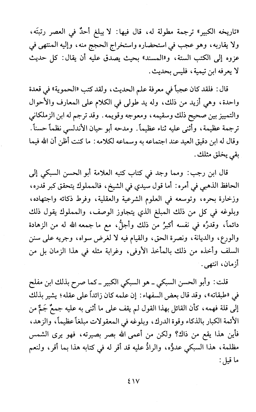 قلت: وأبو الحسن السبكي - هو السبكي الكبير - كما صرح بذلك ابن مفلح في "طبقاته"، وقد قال بعض السفهاء: إن علمه كان زائدًا على عقله؛ يشير بذلك إلى قلة فهمه، كأن القائل بهذا القول لم يقف على ما أثنى به عليه جمعٌ جَمٌّ من الأئمة الكبار بالذكاء وقوة الدرك، وبلوغه في المعقولات مبلغًا عظيمًا، والزهد، فأين هذا يقع من ذاك؟ ولكن من أعمى الله بصر بصيرته، فهو يرى الشمس مظلمة، هذا السبكي عدوُّه، والرادُّ عليه قد أقر له في كتابه هذا بما أقر، ولنعم ما قيل: